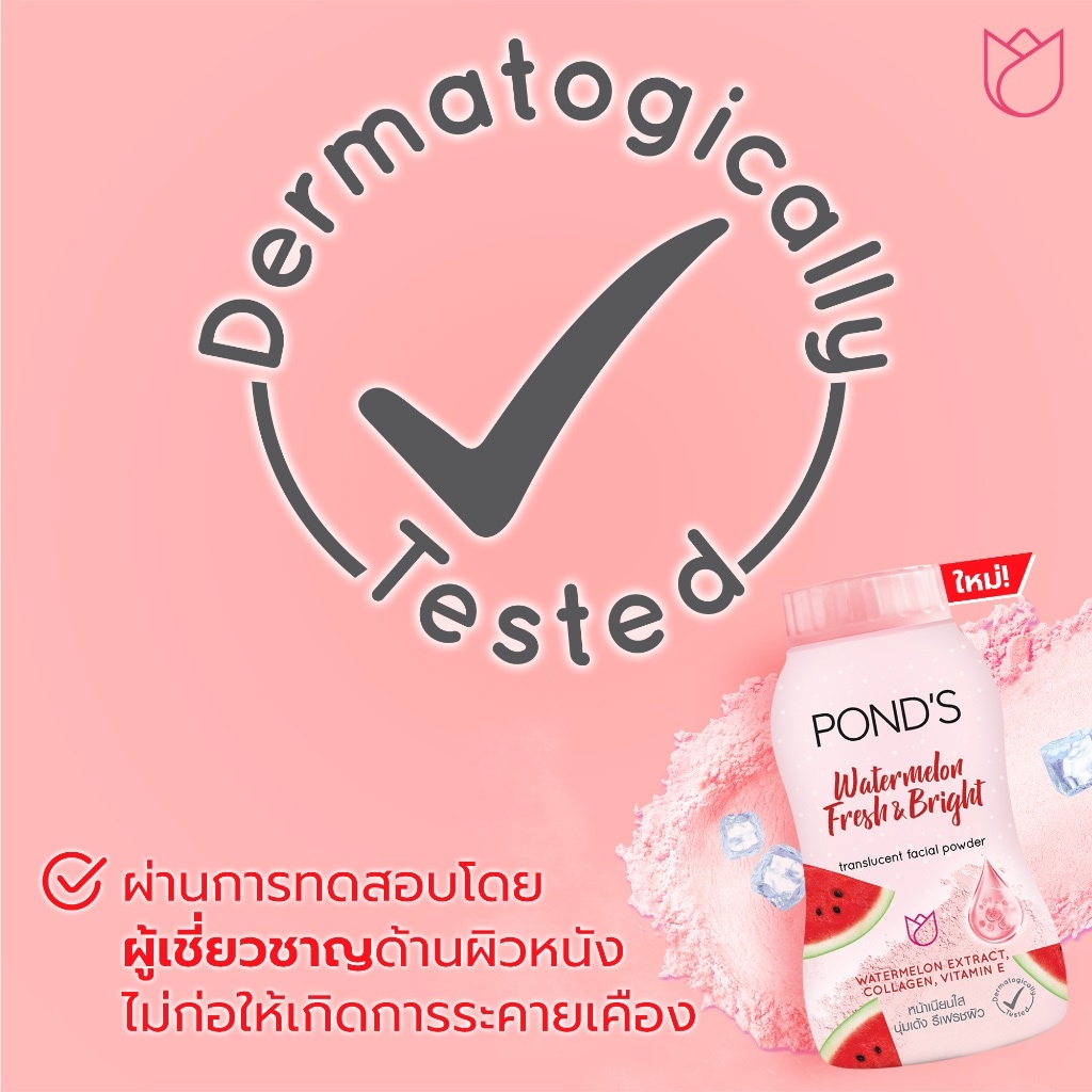 Pond'S Powder Watermelon Fresh & Bright Translucent loose powder, watermelon formula, helps brighten the skin. Combining the power of collagen Watermelon extract and Vitamin E that are known to soften and bounce the skin. Retains moisture, does not dry out the skin. For smooth face as well as helping to refresh the skin from the heat, makes your skin feel refreshed. Tested for irritation by dermatologists. Fine powder texture, light, suitable for all skin tones. Watermelon Talcum for this summer - Watermelon refreshing - Collagen bouncy skin - Vitamin E nourishing - Winning concept