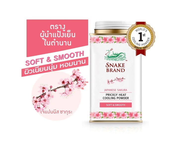 Snake Brand Prickly Heat Cooling Powder Soft&Smooth 280g with a sweet aroma and a mixture of extracts of flowers. - Elderflower, Rose, Jasmine, Daisy และ Cherry Blossom which will helps skin to soften and moisturizing, healthy, cool, fragrant, long lasting, fresh skin, happy every day.