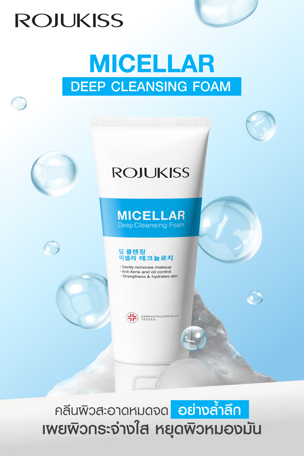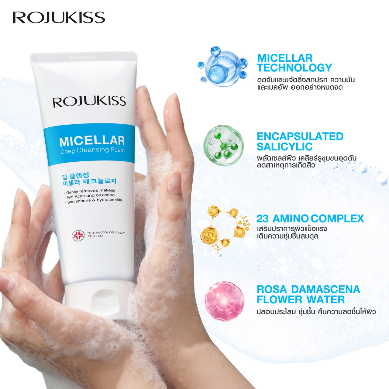 ROJUKISS MICELLAR DEEP CLEANSING FOAM features a soft, creamy texture that deeply cleanses the skin with Micellar Technology. It gently removes makeup, excess oil, pollution, and impurities while combining Encapsulated Salicylic Acid, 23 Amino Complex, and Rose Water to exfoliate dead skin cells, reduce acne-causing factors, and deeply clean every pore. It strengthens the skin barrier, soothes the skin, and provides lasting hydration for soft, healthy-looking skin. The formula does not irritate or strip the skin, leaving it fresh, gentle, and suitable for daily use. Apply an appropriate amount onto your palm, mix with a small amount of water, gently massage over the entire face, then rinse thoroughly with clean water. Avoid contact with eyes.