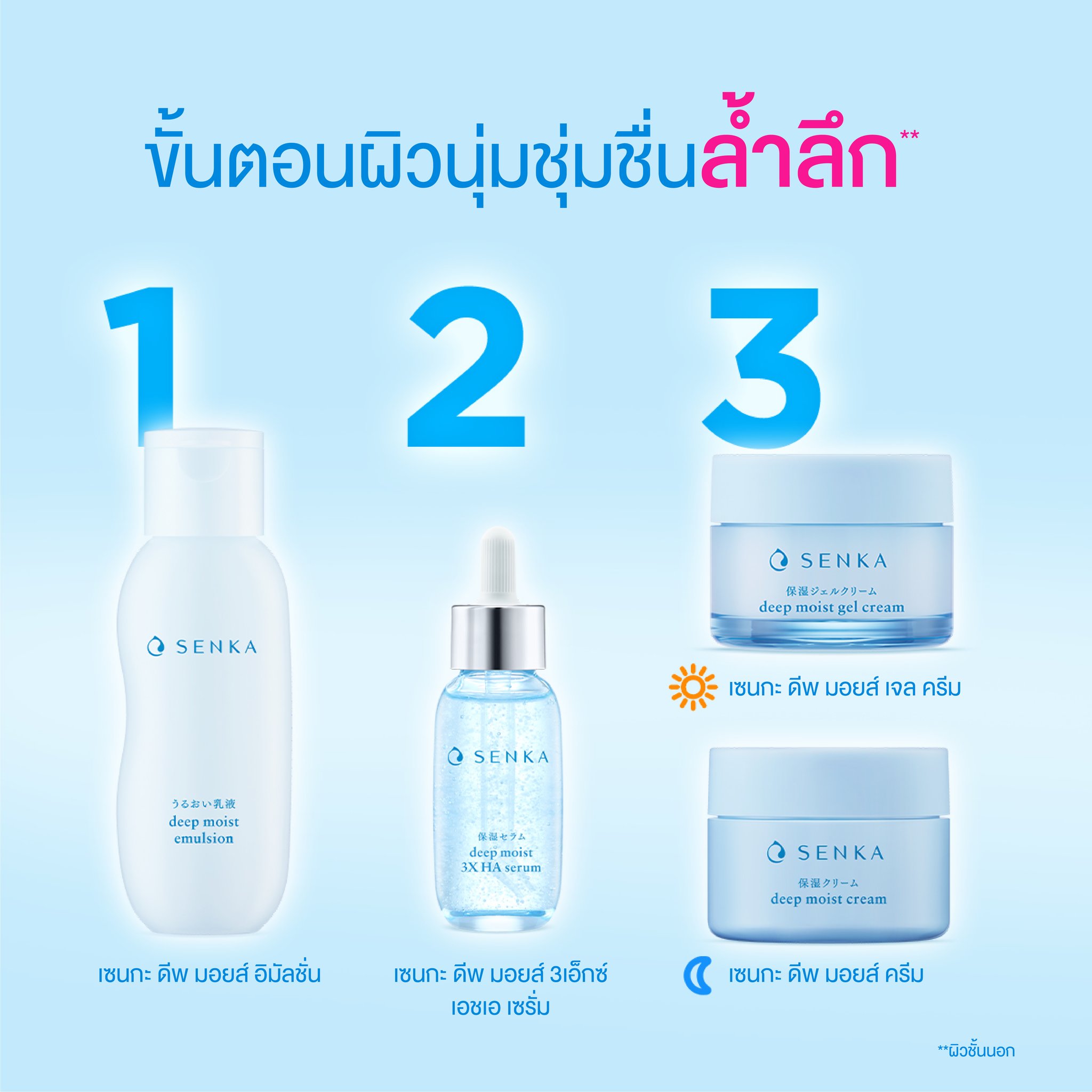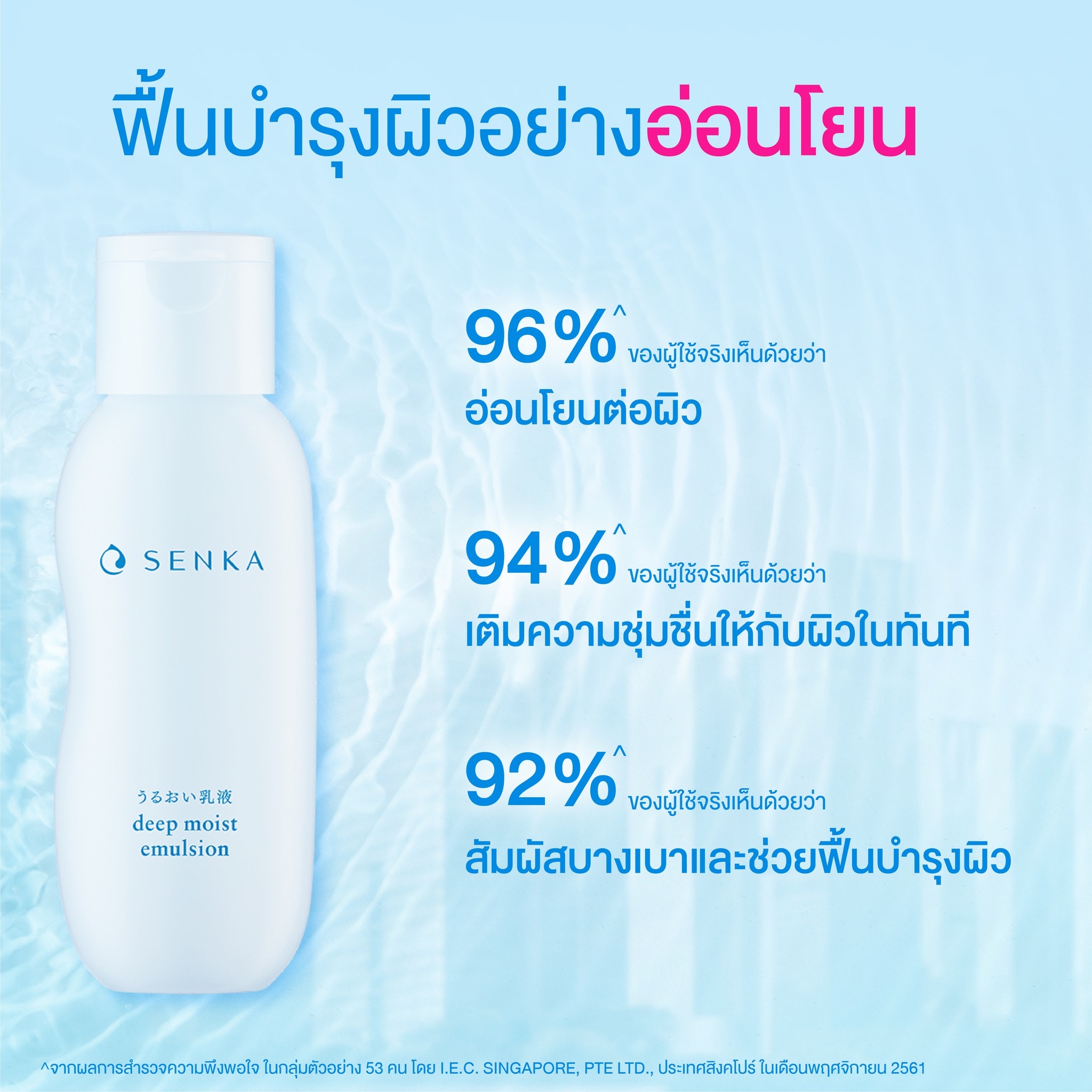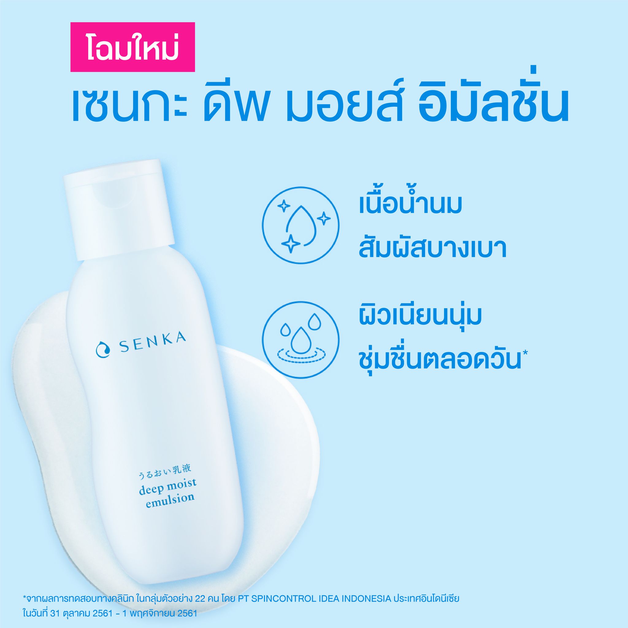 SENKA deep moist emulsion with lightweight milk-like texture helps locks hydration into skin. Nourishes skin and keeps it feeling supple, soft & deeply moisturized all day. Reveal richly moisturized beautiful bare skin. -Lightweight & non-sticky with instant absorption -Helps lock hydration into skin. Nourishes and keeps skin ifeeling supple, soft & deeply all day long lasting moisturization -Gentle to skin. Alcohol free / fragrance free / Colorant free -Dermatologist tested -SENKA's unique NATU-ENCE "Nature x Science" Formula Moisturizing ingredients Double Hyaluronic Acid & Marine Collagen Naturally derived ingredients Rice Bran Oil, Honey, White Cocoon Essence Epidermis According to Clinical test data from PT SPINCONTROL IDEA INDONESIA, indonesia, with 22 subjects during 31 October 2018 - 1 November 2018. According to Consumer test data from I.E.C. SINGAPORE, PTE LTD.,Singapore, with 54 subjects on November 2018.