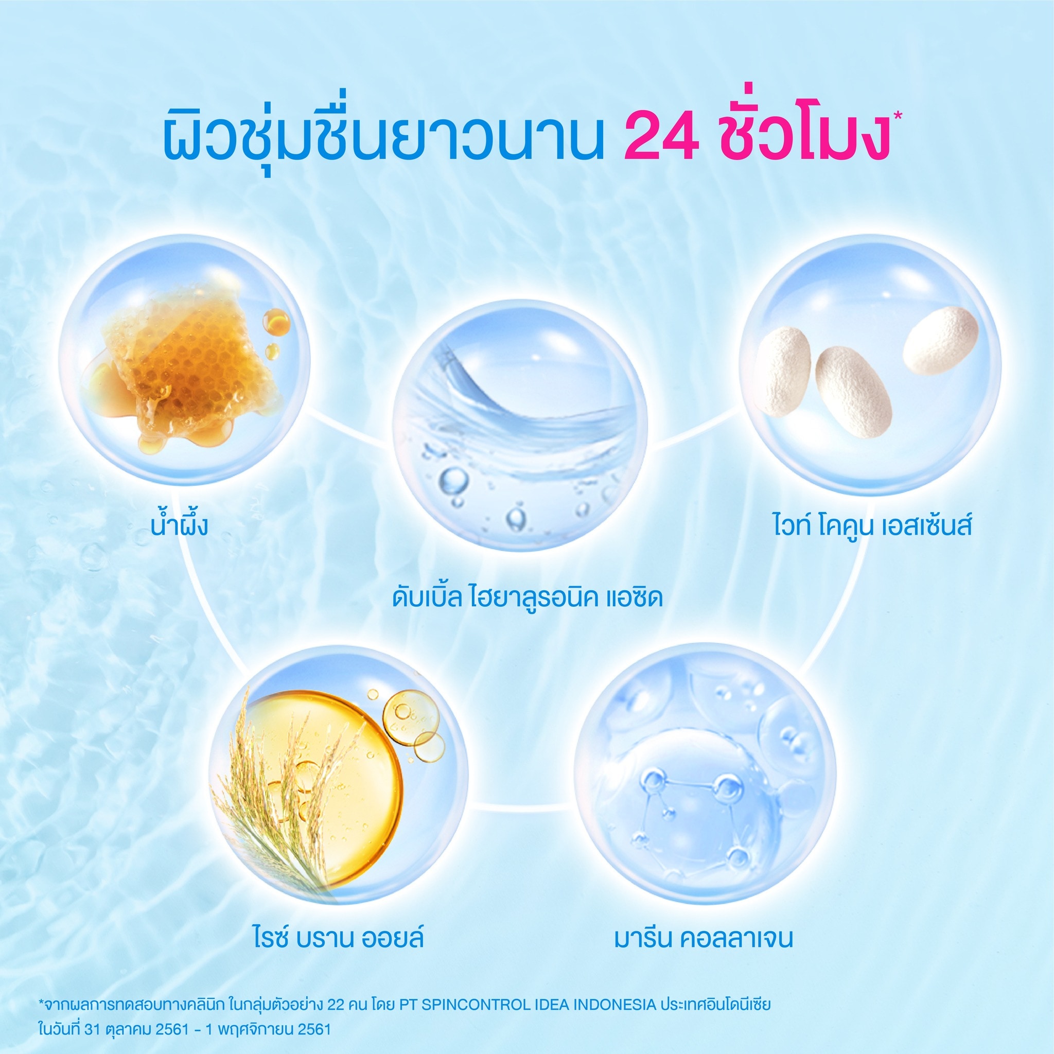Water, Dipropylene Glycol, Glycerin, Cetyl Ethylhexanoate, Butylene Glycol, Mineral oil (Paraffinum Liquidum), PEG-20, Dimethicone, PEG-60 Glyceryl Isostearate, PEG/PPG-14/7 Dimethyl Ether, PEG-5 Glyceryl Stearate, Phenoxyethanol, PEG-400, Behenyl Alcohol, Stearic Acid, Behenic Acid, Isostearic Acid, Petrolatum, Methylparaben, Carbomer, Polyvinyl Alcohol, Xanthan Gum, Potassium Hydroxide, Disodium EDTA, Sodium Metabisulfite, Honey (Mel), Oryza Sativa (Rice) Germ Oil, Sodium Hyaluronate, Tocopherol, Sodium Acetylated Hyaluronate, Sericin, Citric Acid, Potassium Sorbate, Soluble Collagen