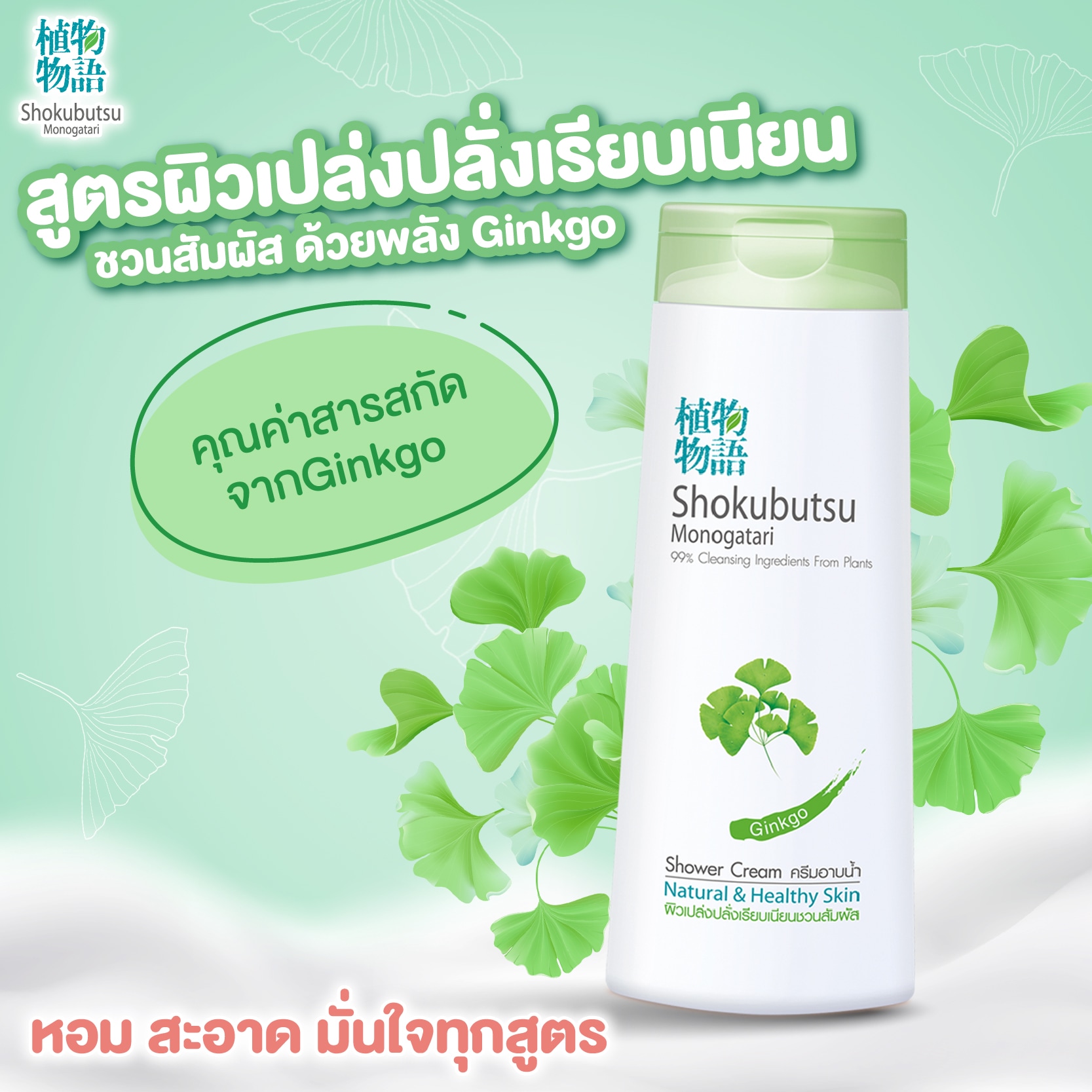 Shokubutsu Monogatari Shower Cream Ginkgo Natural Healthy Skin 99 Cleansing ingredients from plants. The best choice to help your skin feeling nourished, brighter and freshly cleansed from ginkgo extract. Moreover, Moisture lock technology help to keep moisture in the skin and protect your skin from irritation. Cleanse with 99 Anti-bacteria and give a fresh scent. as ASTME2315, Pseudomonas aeruginosa ATCC27853, Escherichia coli ATCC25922, Staphylococcus aureus ATCC6538 (Chinese Milk Vetch, Japanese Camellia, Ginkgo, Orange Peel Oil, Oat milk Shea butter)