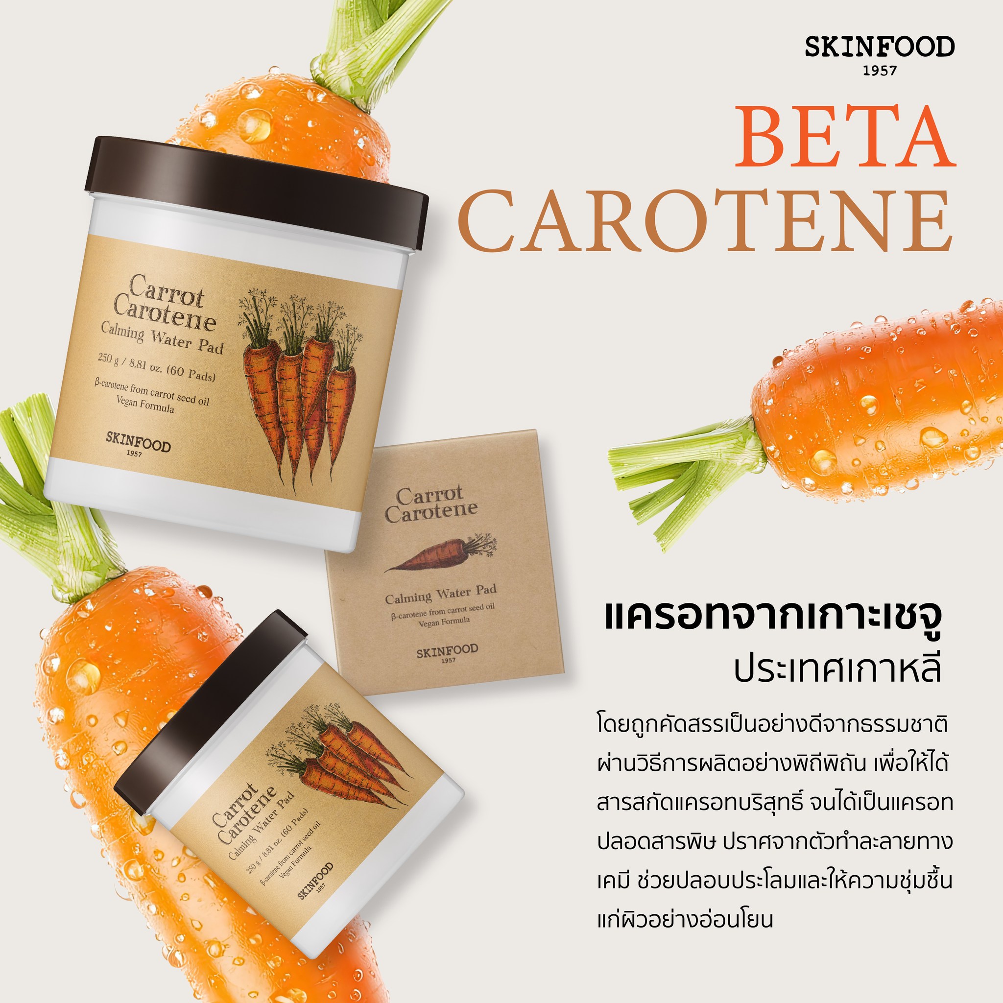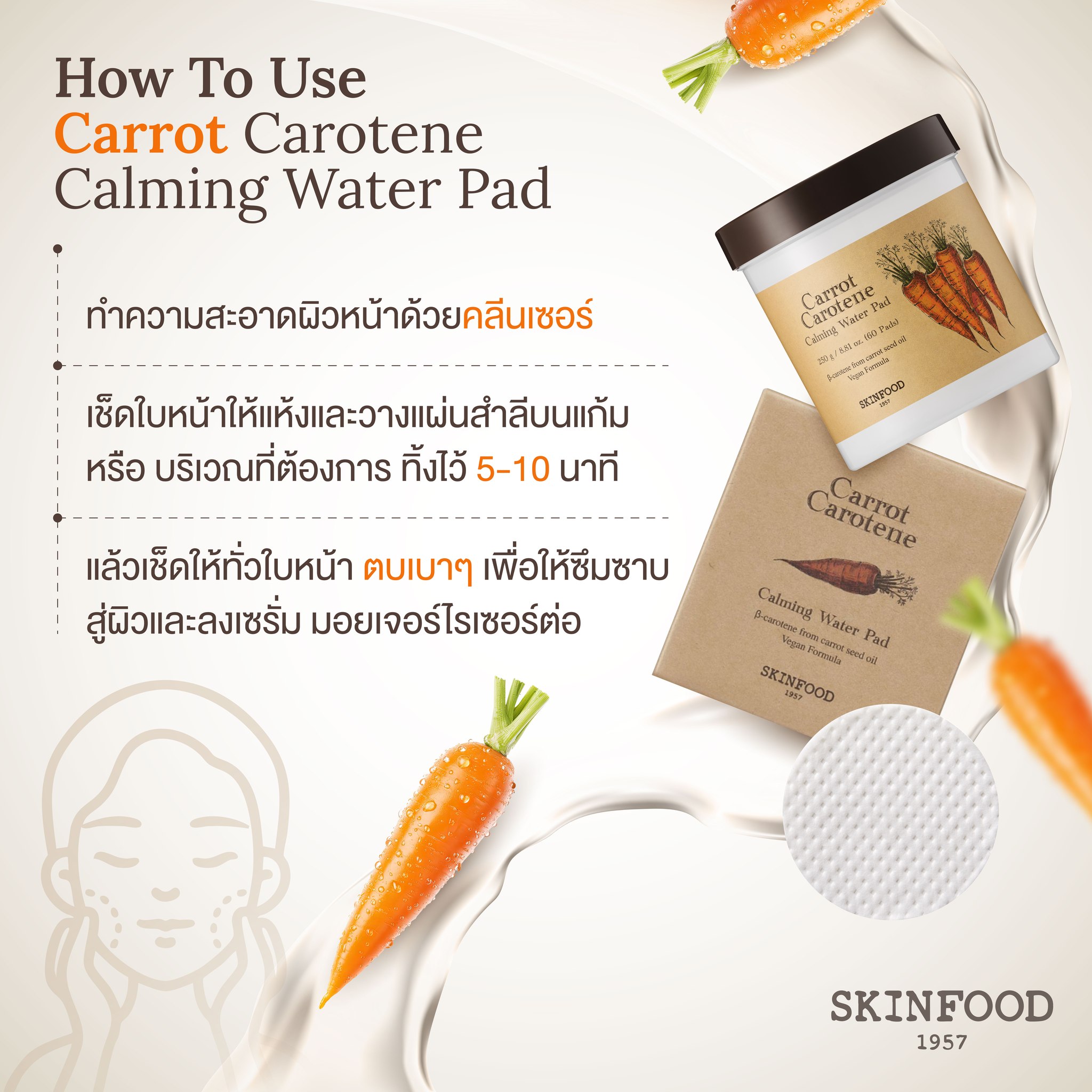 Skinfood Carrot Carotene Calming Water Pad A moisture pad enriched with beta-carotene from carefully selected natural carrot seed oil and meticulously processed to obtain pure carrot extract free from chemical solvents. Serves with a thick, soft, waffle-textured cotton pad designed to reduce skin friction, soothing and gently hydrating the skin. Dermatologically tested for skin irritation. 7 Free Parabens, alcohol, artificial color, silicone, mineral oil, Preservative and Triethanolamine (TEA) After cleansing, place pads onto both cheeks or areas that need soothing. After about 5-10 minutes, gently wipe the entire face, avoiding the eye areas, then pat the remaining essence lightly to absorb.