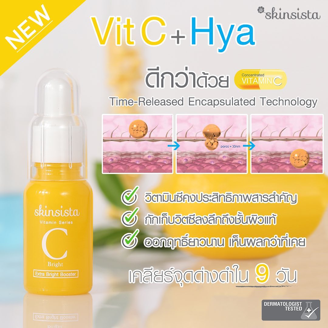 Vit C extra bright Booster is the latest innovation from Skinsista. Concentrated Time-released encapsulated Vitamin C delivers the ingredient throughout the day to enhance antioxidant level as well as effective reducing the levels of melanin underneath your facial skin. The light-weight essence filled with Hyaluronic acid to boost 90% collagen production. The result is noticeably radiance brighten skin tone and healthy, younger looking skin in 9 days.
