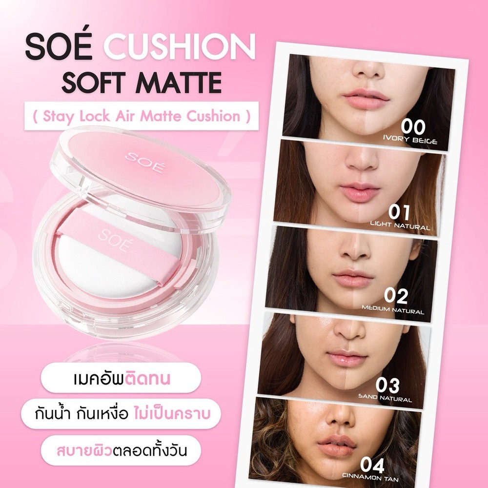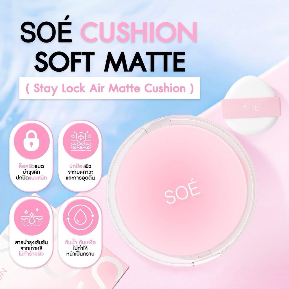 SOE Stay Lock Air Matte Cushion SPF 42 PA+++, 15grams. This lightweight matte cushion foundation provides a soft matte finish, offering smooth coverage without drying out or settling into creases. Featuring INNO-MATTE TECHNOLOGY, it controls oil, is long-lasting, non-greasy, and comfortable on the skin all day. The lightweight formula feels comfortable on the skin, offering natural coverage in a shade suitable for Asian skin tones. It's long-lasting, sweat-resistant, and contains imported extracts to nourish and protect skin from UVA/UVB rays with SPF 42 PA+++. This product contains 7 types of extracts Nano White helps brighten and even out skin tone Alpha Arbutin helps reduce facial blemishes Vitamin E strengthens the skin and reduces inflammation Jojoba oil is gentle and suitable for sensitive skin 39 types of Amino Acids help retain moisture without increasing oiliness Jeju Sea Water provides deep hydration to help the skin fight against the formation of wrinkles and Aloe Vera Extract reduces irritation and increases skin hydration.