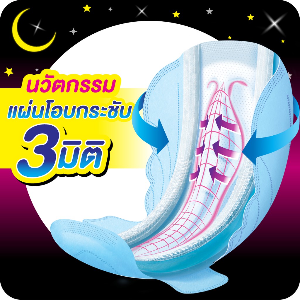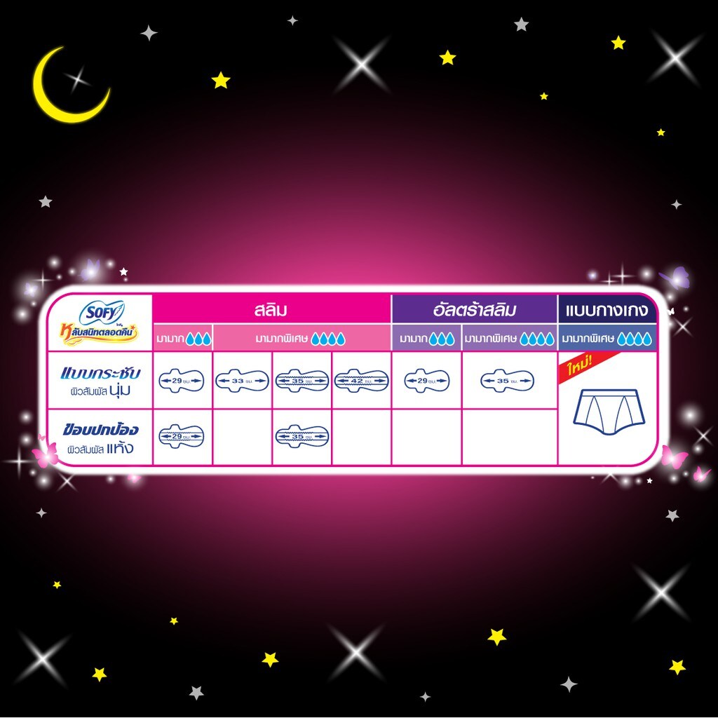 Sofy Bab Kra Chub Lab Sanid Talord Khuen 33 cm. Sofy Lab Sanid Talord Khuen, prevent all post, Confident all night with innovation 3D Wrap fit sheet that adjust to body, closely attach all curves.Lock period not flow through bottom crotch, prevent back leakage even toss and turn all night.Soft pad with special absorption hole wide across the sheet, Absorb immediately.