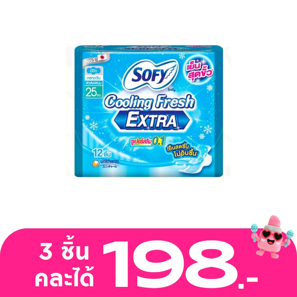 Sofy Cooling Fresh Extra Day Super Slim 0.1 Wing 25 cm. Sofy Cooling Fresh Extra Day Napkin, Explode NEW Cool power technology combined with new level of Cool pad gives a feeling of full freshness reduce stuffiness reduce humidity cause of smell and comfort like wearing with underwear. Coolest feeling, Coolest napkin than ever Feel Ultimate Cool and Fresh like 1 st time using Cool napkin, Long-Lasting Extra Fresh Cool, No stuffy, Lock Odor, Quickly Absorbs, dries and flexible in any situation. The only innovation from Sofy, individually wrapped, can keep cold for a long time.