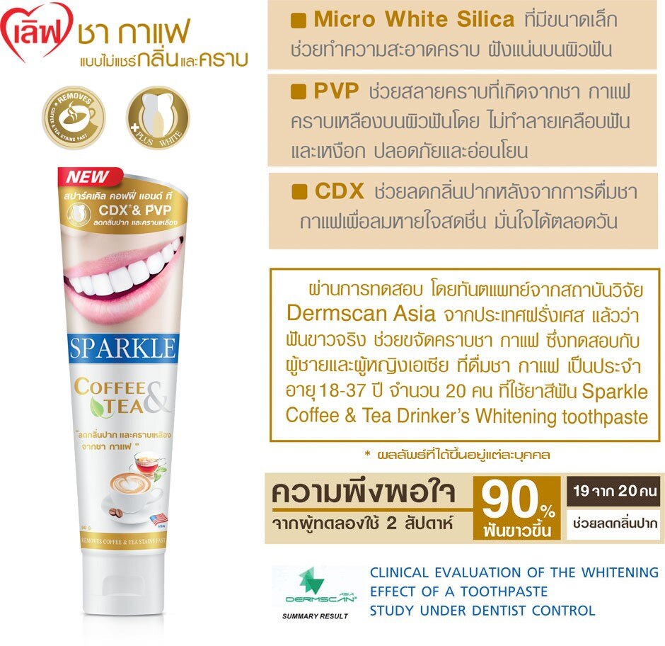 Sparkle, Coffee & Tea Drinkers’ Whitening Toothpaste employs the latest advances in stain removing technology and will polish away coffee and tea stains fast, giving coffee & tea drinkers whiter, brighter, healthier looking teeth. This groundbreaking new dental formula contains Micro White Particles, which actively target discoloration and yellowing on the tooth enamel caused by the consumption of coffee and tea over time.Sparkle exclusive Micro White Silica Formula also helps to prevent new stains from forming, leaving your teeth whiter, shinier and glossier, while a unique cool mint taste freshens breath from the effects of coffee.