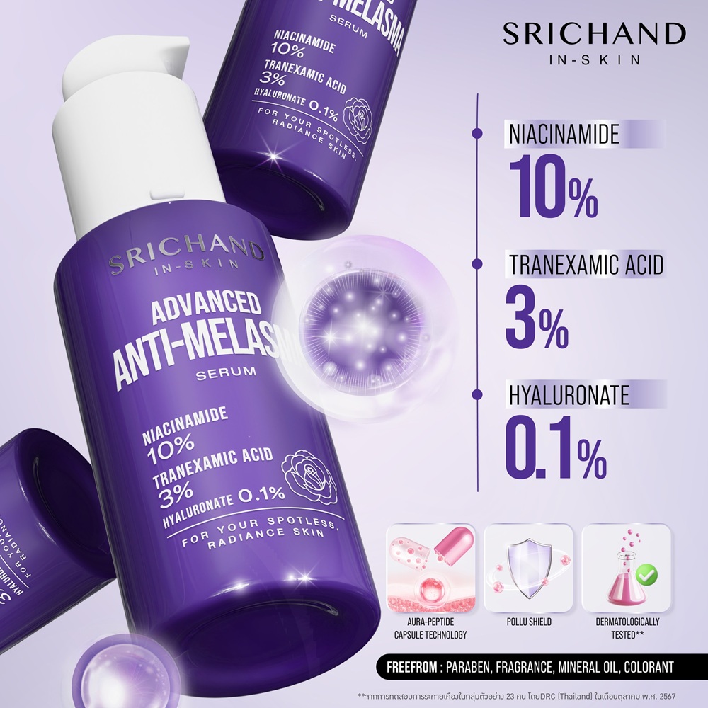 Srichand Advanced Anti Melasma Serum Serum for Melasma Dark Spots and Sun Spots Visible Improvement in 7 Days Highly effective yet gentle this serum does not cause skin irritation. It contains 10 nourishing molecules and SlowRelease Fast Action Technology which helps even out skin tone and enhance radiance. Additionally it provides deep hydration to protect and soothe the skin from environmental stressors.Niacinamide helps brighten the skin smooth texture and maintain moisture.Tranexamic Acid reduces dark spots and helps even out skin tone.Hyaluronate deeply hydrates the skin leaving it soft and smooth.AuraPeptide Capsule Peptide Technology reveals radiant and glowing skin.