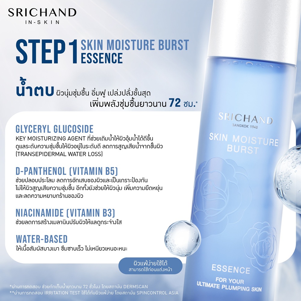 Prepare your skin with Skin Moisture Burst Essence Hydrate skin to be ultimate glowing wake up your skin to ready for nourishment with super moisturizing ingredients Glyceryl Glucoside the key moisturizing agent to keep skin hydrated and maintain in a great level prevent transepidermal water loss Transepidermal Water Loss D panthenol Vitamin B5 help to soothe up skin and reduce skin irritation act as a sheild to prevent skin s moisture loss enchance skin flexibility and smoothness Niacinamide Vitamin B3 enhance skin barrier and brightening effect Water based texture with light weight touch quick absorption with non stickiness 72 hour moisture long lasting test by Dermscan