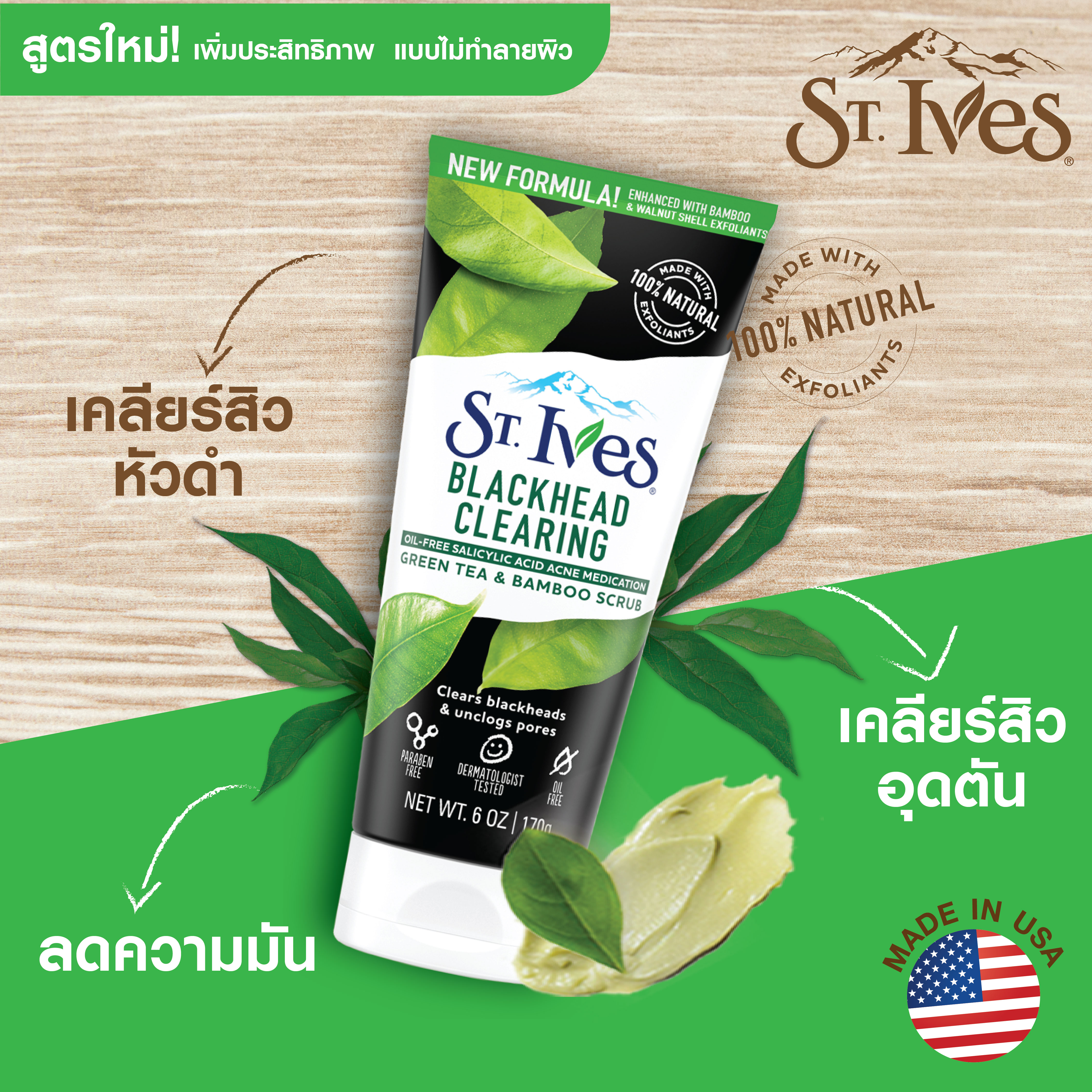 St.Ives Blackhead Clearing Scrub Green Tea Bamboo 170 G. สครับหน้า ขจัดสิวเสี้ยน สิว