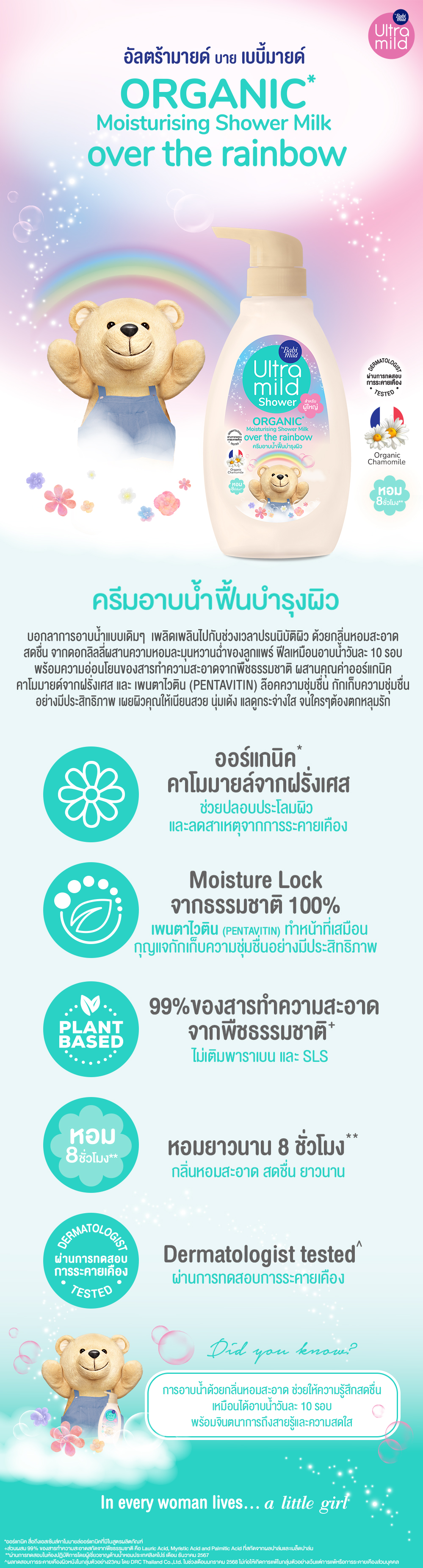 Guarantee mildness from no.1 bestselling brand in baby liquid soap Babi Mild Ultra Mild Organic Moisturising Shower Milk purifies your skin with Hybrid cleanser (Plant based + soap-based surfactant) formulation but mild to skin to ensure your skin is thoroughly cleansed yet still feels soft and alive, not dry and tired. Blended with lily blossoms and the sweet, juicy scent of pear so refreshing it feels like showering 10 times a day. Enriched only with only goodness to revitalizes your skin to give you that baby skin glow you love. With the scent of Rose and Cyclamen - Gentle with Organic chamomile from France - Nourish amp; Moisturize skin to be soft amp; smooth (look healthy) from Milk protein Nourish amp; Moisturize skin with Pentavitin - Plant based ingredients, No paraben, No SLS -Suitable for sensitive skin with Dermatologically tested guarantee no.1 bestselling brand in baby liquid soap during Jan 2016-2022 from NielsenIQ Dermatologically tested in Singapore Apr 2023