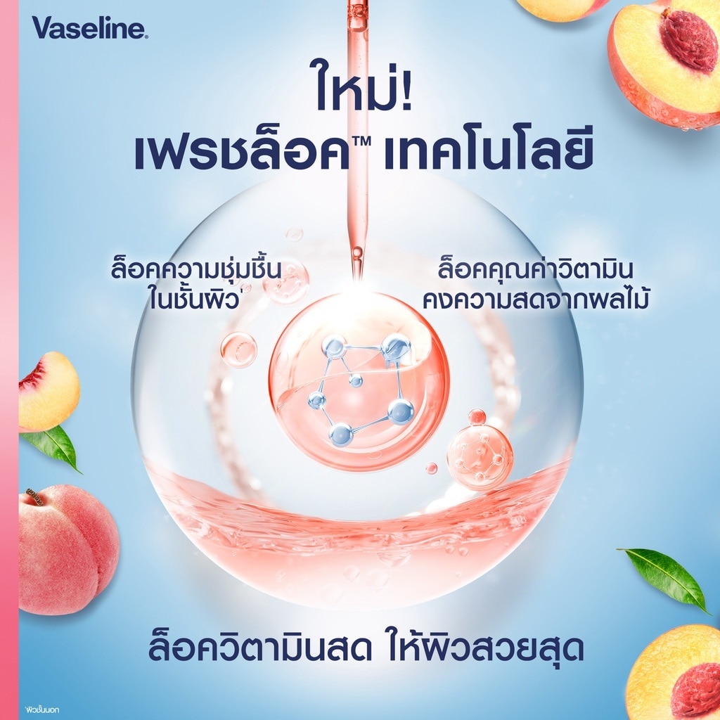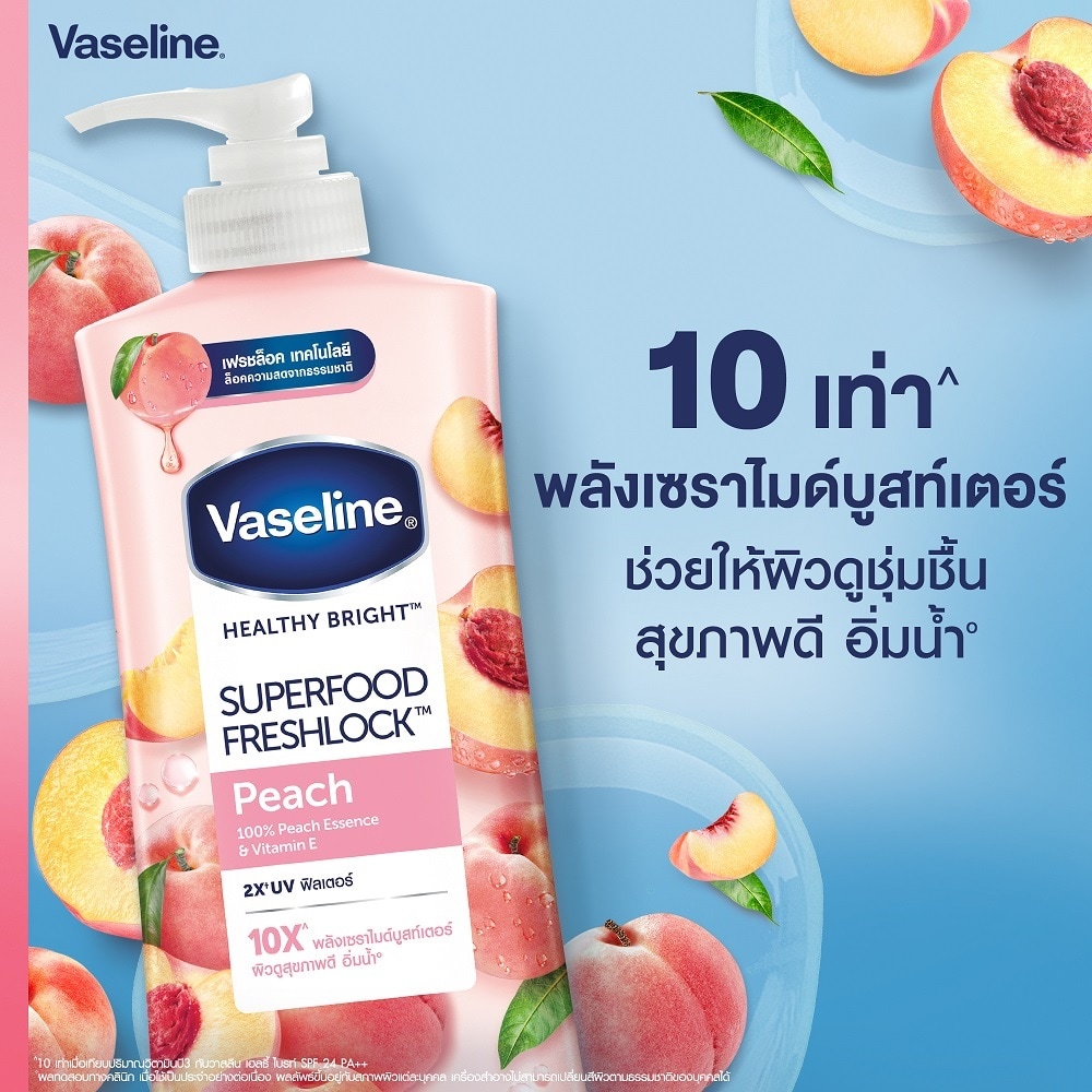 Vaseline Healthy Bright Superfood Freshlock Peach Peach & Prebiotic Vitamin B3 & C Peach is known for great source of Vitamin C and helps skin look bouncy and hydrated and Prebiotic that help restore the appearance of dry skin, leaving skin stronger and healthier looking With UV filter for sun protection Fast absorbing non-greasy serum With soft peach scent Clinical test for a regualar product usage. Results are are varied depending on individual skin condition. Cosmetic products cannot change natural skin tone. for bright, Strong and Hydrated skin apply evenly on skin twice a day for best result