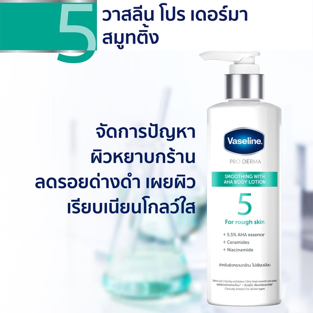 Vaseline Pro Derma AHA Smoothing Body Lotion 1. Repair Combine prebiotics repairing essence with Vaseline Wonder Jelly, to help to promote microbiome balance on skin. 2. Enhance Infuseding with 5.5% AHA essence ,to effectively soften skin, and gently exfoliate dead skin cells. Further enhanced with eCeramides and Niacinamide, to boost and lock moisture into skin. 1st BODY AMPOULE EVER 1. PREMIUMIZE &&.,& LEVERAGE TREND FROM FACECARE 2.HIGHLY CONCENTRATED INGREDIENTS 3.PERFECTING YOUR BODY SKIN JUST LIKE YOUR FACE 5.5% AHA ESSENCE SMOOTHENING &&.,& EXFOLIATING 5.5% AHA ESSENCE GENTLY REMOVE DEAD CELLS, SMOOTHEN BUMPY SKIN