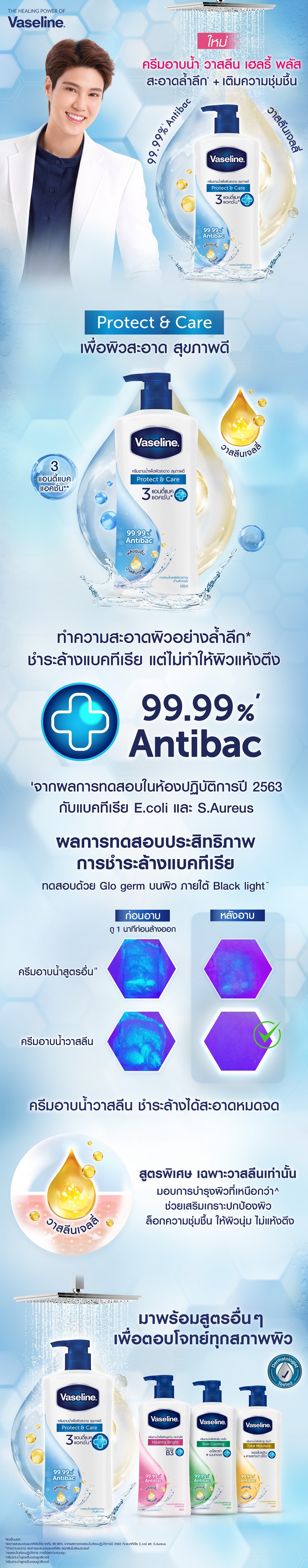 A Healthy skin is a clean and nourished skin. Vaseline healthy moisturizing bodywash clean&care washes away bacteria and actively nourishes your skin with a special moisturizing nutrient from Vaseline lotion. With the power of 3 anti-bac actions** for 99.99%* bacteria reduction.