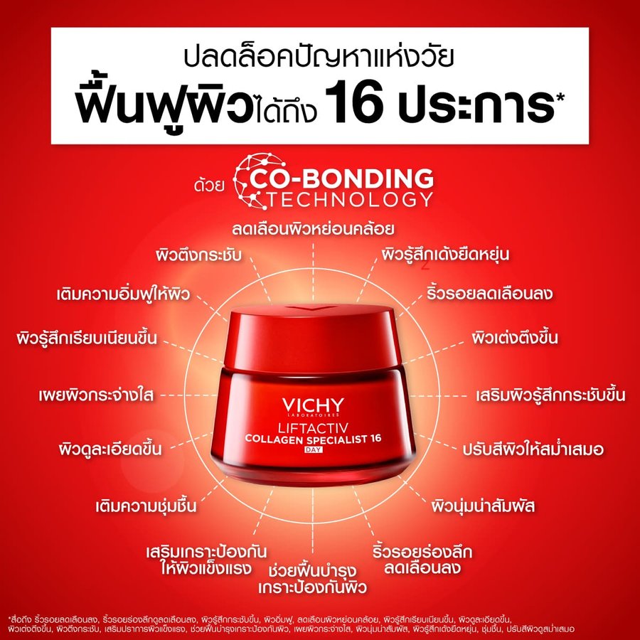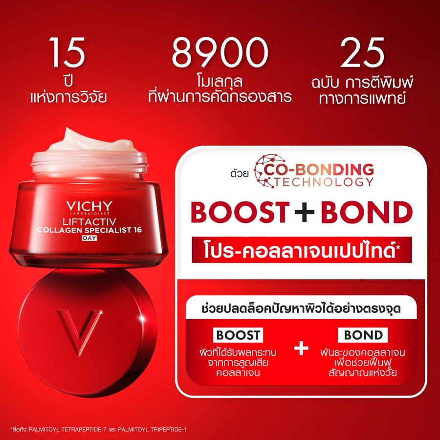 Vichy Liftactiv Collagen Specialist 16 Day Cream, with its Co-bonding technology, boosts and bonds powerful molecules selected by Vichy,
