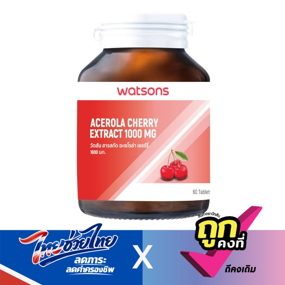 Watsons Acerola Cherry Extract 1000 mg (Dietary Supplement Product) contains Acerola Cherry Extract. Net weight 91.8 g/bottle (60 tablets).