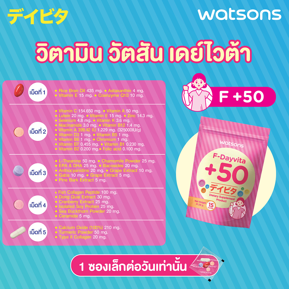 Watsons F-Dayvita +50 (Dietary Supplement Product) Formula 1 in 1 Softgel contains : REFINED RICE BRAN OIL 435 mg., HAEMATOCOCCUS PLUVIALIS EXTRACT 40 mg., MIXED TOCOPHEROLS (PROVIDES VITAMIN E 176 IU/G) 15 mg., COENZYME Q10 10 mg. Capsule Structure (INS 428), Humectant (INS 422,INS 420(i)), Natural Color (INS 171), Synthetic Color (INS 124,INS 133). Information for Food Allergies : Contains Product from Fish. Net Weight 750 mg./Softgel Formula 2 in 1 Tablet contains : ASCORBIC ACID (97) 154.65 mg., beta-carotene(1) 50 mg., MARIGOLD EXTRACT 20 mg., DL-alpha-tocopheryl acetate (50) 15 mg., ZINC OXIDE 14.3 mg., SELENIUM ENRICHED YEAST (PROVIDE SELENIUM 0.2) 4.8 mg., VITAMIN K2 (0.25 ) 3.6 mg., NIACINAMIDE 3 mg., VITAMIN B12 (0.1) 1.4 mg., Vitamin A Acetate (325000IU/g) 1.229 mg., VITAMIN D3 (105000IU/G) 1 mg., D-PANTOTHENATE,CALCIUM 1 mg., PYRIDOXINE HYDROCHLORIDE 1 mg., CHROMIUM PICOLINATE 1 mg., D-BIOTIN 0.455 mg., THIAMINE HYDROCHLORIDE 0.23 mg., RIBOFLAVIN 98 0.2 mg., FOLIC ACID 0.1 mg. Bulking agent (INS 460(i) and MALTODEXTRIN), Anticaking agent (INS 470(iii),INS 553(iii)), Glazing agent (INS 1203), Natural Color (INS 171), Emulsifier (INS 1521,INS 322(i)), Synthetic Color (INS 102,INS110,INS 133,INS 124). Net Weight 312 mg./Tablet Formula 3 in 1 Tablet contains : L-THEANINE 50 mg., CHAMOMILE POWDER 25 mg., EPA AND DHA 8.75 FROM UNNAMED FISH OIL POWDER 25 mg., BRAHMI EXTRACT 20 mg., BILBERRY EXTRACT 20 mg., PHARMAGABA (GAMMA-AMINOBUTYRIC ACID) 10 mg., OLIVE EXTRACT 10 mg., GRAPE SKIN EXTRACT 10 mg., GRAPE SEED EXTRACT 5 mg., PINE BARK EXTRACT 5 mg. Bulking agent (INS 460(i) and MALTODEXTRIN), Anticaking agent (INS 470(iii),INS 553(iii)), Glazing agent (INS 1203), Natural Color (INS 171), Emulsifier (INS 1521,INS 322(i)), Synthetic Color (INS 124,INS 133,INS 110,INS 102). Information for Food Allergies : Contains Product from Fish. Net Weight 312 mg./Tablet Formula 4 in 1 Tablet contains : FISH COLLAGEN PEPTIDE 100 mg., DONG QUAI EXTRACT 30 mg., Isolated Soy Protein 25 mg., CRANBERRY EXTRACT 25 mg., SEA BUCKTHORN POWDER 20 mg., RICE EXTRACT 5 mg. Bulking agent (INS 460(i) and MALTODEXTRIN), Anticaking agent (INS 470(iii),INS 553(iii)), Glazing agent (INS 1203), Natural Color (INS 171), Emulsifier (INS 1521,INS 322(i)), Synthetic Color (INS 110,INS 102,INS 124). Information for Food Allergies : Contains Product from Fish and Soy. Net Weight 312 mg./Tablet Formula 5 in 1 Capsule contains : CALCIUM OXIDE 210 mg., TURMERIC POWDER 50 mg., TYPE II COLLAGEN 20 mg. Bulking agent (MALTODEXTRIN), Anticaking agent (INS 470(iii),INS 551), capsule structure (INS 428), Natural Color (INS 171). Net Weight 400 mg./Capsule