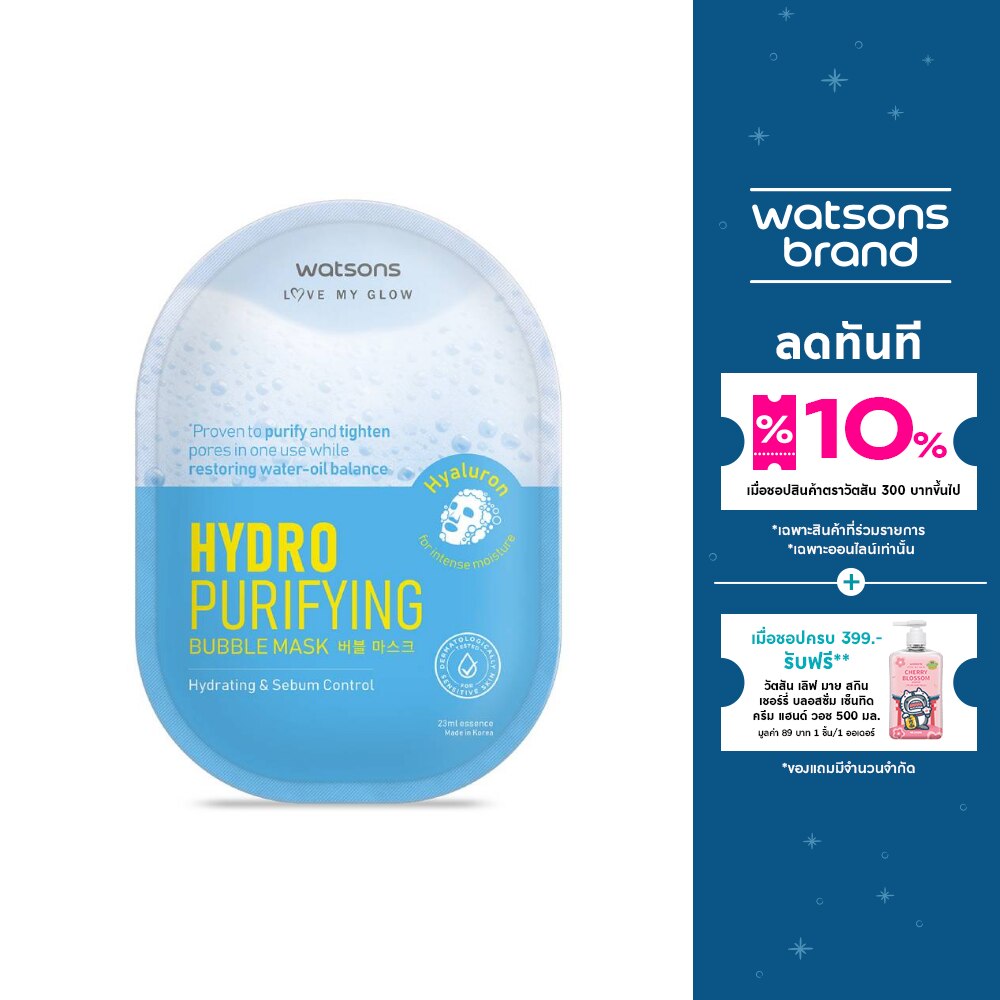 Watsons Hydro Purifying Bubble Mask that Elevate your skincare regimen with our purifying and hydrating sheet mask. Binchotan Mask Sheet, Infused with rich fine bubbles absorbing into skin to cleanse excess sebum and impurities effectively. This mask replenishes and locks in moisture with Hyaluronic Acid, leaving your skin clear, dewy and deeply hydrated. Apply mask onto the face. Leave for 10-15 minutes, Gently massage the remaining bubbles into the skin and rinse with lukewarm water. Use 1-2 times per week for best results.