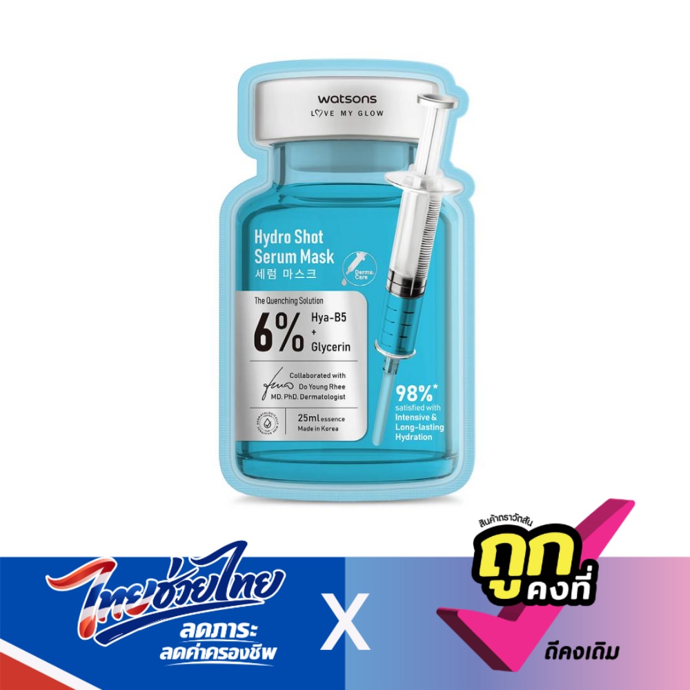 Watsons Hydro Shot Serum Mask. Elevate your beauty routine with the formulation equivalent of 10 bottles of serum in just one mask. Experience deeply hydrated and nourished skin like never before with his advanced product infused with hero moisturizing ingredients Hyaluronic Acid, Vitamin B5 and Glycerin. The thin layer of our 100 cellulose mask sheets ensures maximum absorption, hugging every contour of your face to deliver the essence effectively and evenly. Indulge in a beauty treatment experience at home with masks that pamper your skin and leave you with a moisturized, dewy complexion. Developed and endorsed by a Korean dermatologist. This product was formulated without over 20 unwanted ingredients and The Mask Sheet has been replaced by a 100percent Cellulose Mask sheet