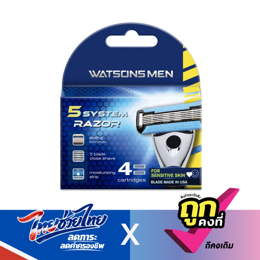 Watsons Men 5 System Razor 4 Cartridges provides a smooth, comfortable shave, with and added trimmer blade for hard to shave areas such as goatees, sideburns, under the nose and the back of the neck. Optimized lubrication strip with Aloe Vera, Shea Butter, Jojoba Seed and Grape Seed Oil for reduced irritation and for a comfortable shave. Promote the reuse of a full original packaging, to reduce packaging waste. The use of this refill pack helps reducing packaging waste.