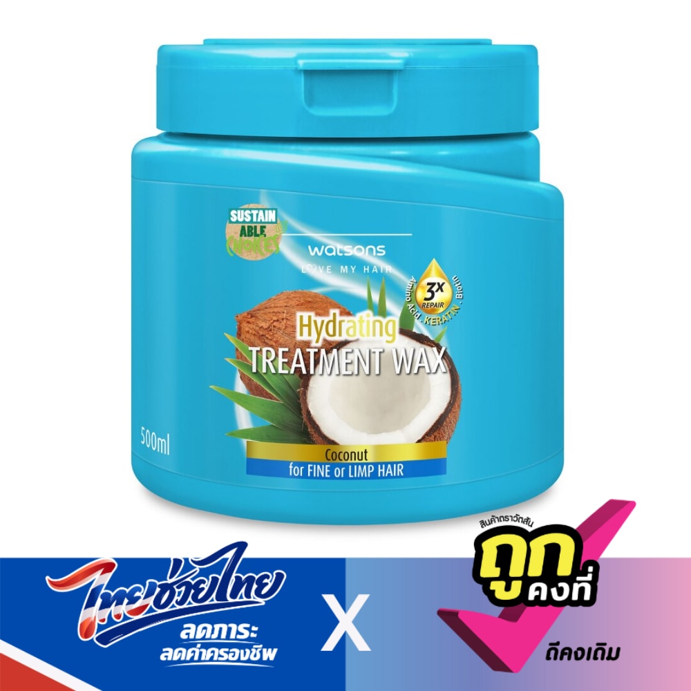 Watsons Treatment Wax Coconut for Fine or Limp Hair.Enjoy a salon treatment for your hair at home. Reinforced with hair-strengthening Keratin, this exclusive blend combines the beauty vitamin Biotin and 11 types of Amino Acid to help make hair more resilient and maintain scalp health while imparting long-lasting moisture for beautiful, silky-smooth results. Coconut Oil Deep moisturise Hydrolyzed Collagen Repair damage amp;restore smoothness Shea Butter Conditioner amp;nourish Free from Paraben Mineral Oil SLES SLS MI/MIT Alcohol Keep out of reach of children. Avoid contact with eyes. If contact occurs, rinse immediately with water. If any irritation occurs, stop use and consult a doctor if necessary.Promote a reduced usage of virgin materials by using recycled content instead.The bottle is made with 30 Post-Consumer Recycled plastic.