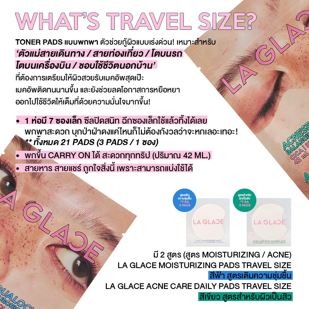 1. ลา กลาส เดลี่ มอยเจอร์ไรเซอร์ แพด อะควาล็อก12 21ชิ้น โทนเนอร์แพดสูตรชุ่มชื้น บำรุงผิวได้อย่างเข้มข้น เอกสิทธิ์หนึ่งเดียวจากลากลาส สารสกัดพิเศษนำเข้าจากประเทศเกาหลี ที่รวมเอากรดไฮยาลูโรนิก 12 ชนิด เหมาะสำหรับใช้เป็นขั้นตอนแรกของการบำรุงผิวซึมผ่านชั้นผิวได้อย่างล้ำลึก ไม่กองบนผิว ไม่รบกวนเมคอัพ ด้วยเนื้อเอสเซนส์บางเบาแต่สารสกัดแน่น เติมน้ำและล็อคความชุ่มชื้นให้ผิวอิ่มฟู เป็นอีกตัวช่วยกู้ผิวฉุกเฉินให้ผิวเย็นลง ปลุกผิวที่อ่อนล้าให้ตื่น พร้อมรับสกินแคร์ แต่งหน้าต่อได้ทันทีโดยไม่ต้องล้างออก ช่วยลดอุณหภูมิผิวให้ผิวเย็นลง ผิวแลดูฟูขึ้นอย่างเร่งด่วน ทำให้เมคอัพติดทนยาวนานขึ้น ช่วยฟื้นฟูผิวแห้ง ขาดน้ำ2. ลา กลาส แอคเน่ แคร์ เดลี่ คลามมิ่ง แพด 21ชิ้น แอคเน่สเฟียร์ บาลานซ์ซิ่ง สกิน คอมเพล็กซ์ โทนเนอร์แพดสูตรดูแลผิวเป็นสิว ที่ช่วยปลอบประโลมผิวด้วย แอคเน่สเฟียร์ เอกสิทธิ์เฉพาะลากลาสกับการดูแลผิวเป็นสิวอย่างทะนุถนอม ช่วยลดโอกาสการเกิดสิว บรรเทาอาการระคายเคืองจากสิวและผิวอักเสบด้วยสามสารสกัดคอมโบที่เข้าใจผิวเป็นสิวด้วย เซนเทลล่า เอเชียติก้า หรือ ซีไอซีเอ สารสกัดจากใบบัวบก ช่วยปลอบประโลม ลดอาการอักเสบ บูสต์ให้ผิวแข็งแรงขึ้น เหมาะกับผิวเป็นสิว สามารถใช้ได้ทุกสภาพผิว ใช้ได้ทั้งกลางวันและก่อนนอน ใช้ก่อนแต่งหน้า 10 ถึง 15 นาที ก่อนลงสกินแคร์ และกันแดด เพื่อช่วยลดอุณหภูมิผิว เป็นการเตรียมผิวให้แต่งหน้าติดทนมากขึ้น ผิวแพ้ง่ายใช้ได้ และผ่านการทดสอบด้านผิวหนัง ปราศจากแอลกอฮอล์ ปราศจากน้ำหอม ปราศจากซิลิโคน