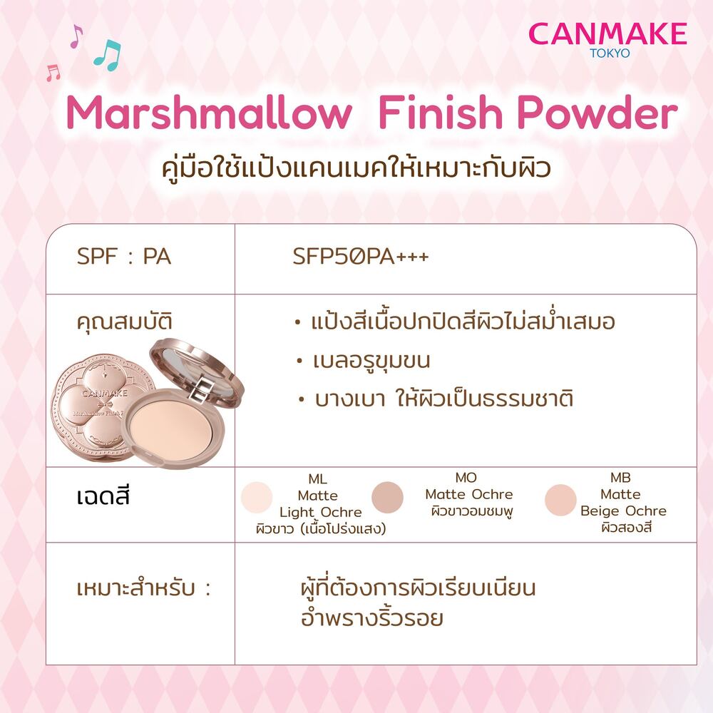 แป้งมาร์ชเมลโลว์ลุคใหม่ ผิวเนียนเรียบลื่น นุ่มละมุนดุจมาร์ชเมลโลว์ แป้งอัดแข็งไม่ผสมรองพื้น เนื้อนุ่ม เนียนละเอียดแนบไปกับผิว มีส่วนผสมของแร่ธาตุและสารบำรุงผิว 15 ชนิด ล้างออกง่ายไม่ง้อคลีนซิ่ง ไม่อุดตันรูขุมขนแป้งไม่ผสมรองพื้น ช่วยคุมมัน เบลอรูขุมขน มีกันแดด SPF 50+ PA+++ พร้อมแร่ธาตุและสารบำรุงผิว 15 ชนิดอ่อนโยนต่อผิว ไม่มีส่วนผสมของน้ำหอมและแฮลกอฮอล์ เหมาะกับผิวบอบบางแพ้ง่าย ล้างออกง่ายไม่ง้อคลีนซิ่ง ไม่อุดตันรูขุมขน Surfactant-free, Tar-based-pigment-free, Alcohol-free และ Fragrance-free มี 3 สีให้เลือก: ML สีโปร่งแสง เหมาะกับผิวขาว, MO เหมาะกับผิวขาวเหลืองและผิวขาวชมพู, MB เหมาะกับผิวสองสี การันตีด้วยรางวัล Cosme Japan จากประเทศญี่ปุ่นแป้งพัฟยอดนิยมจากประเทศญี่ปุ่นขายดีติดกันยาวนานมากกว่า 10 ปี
