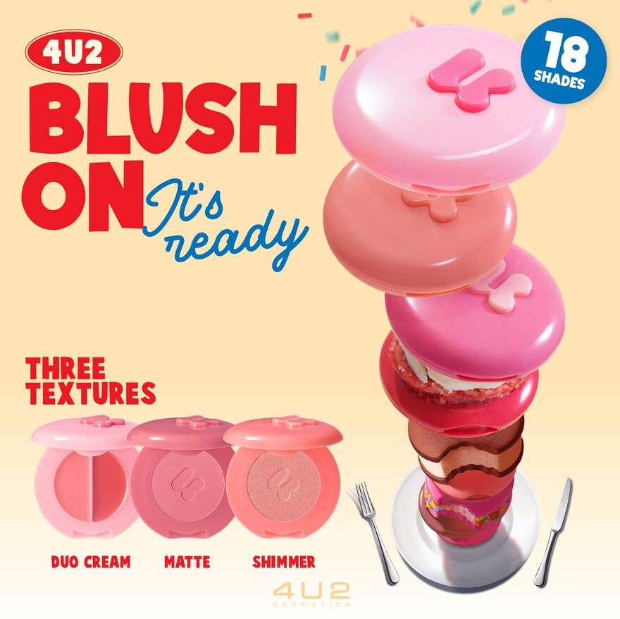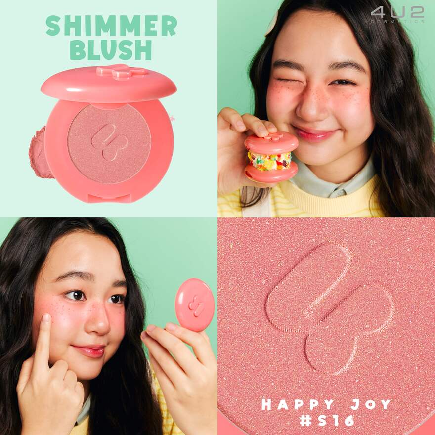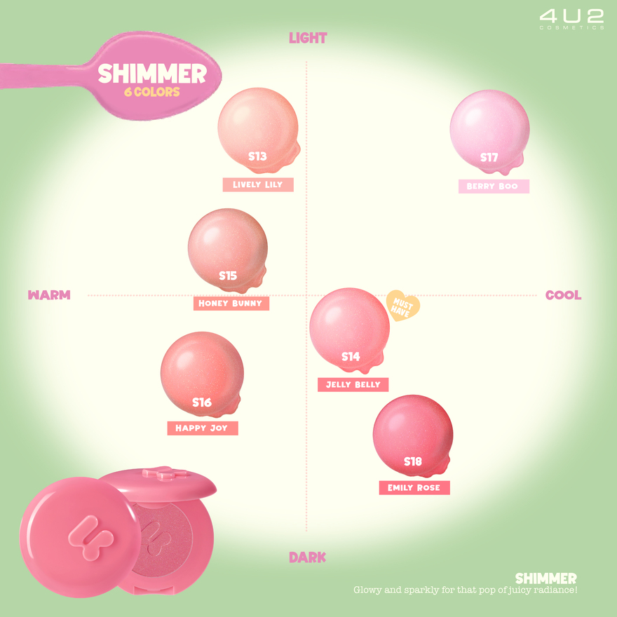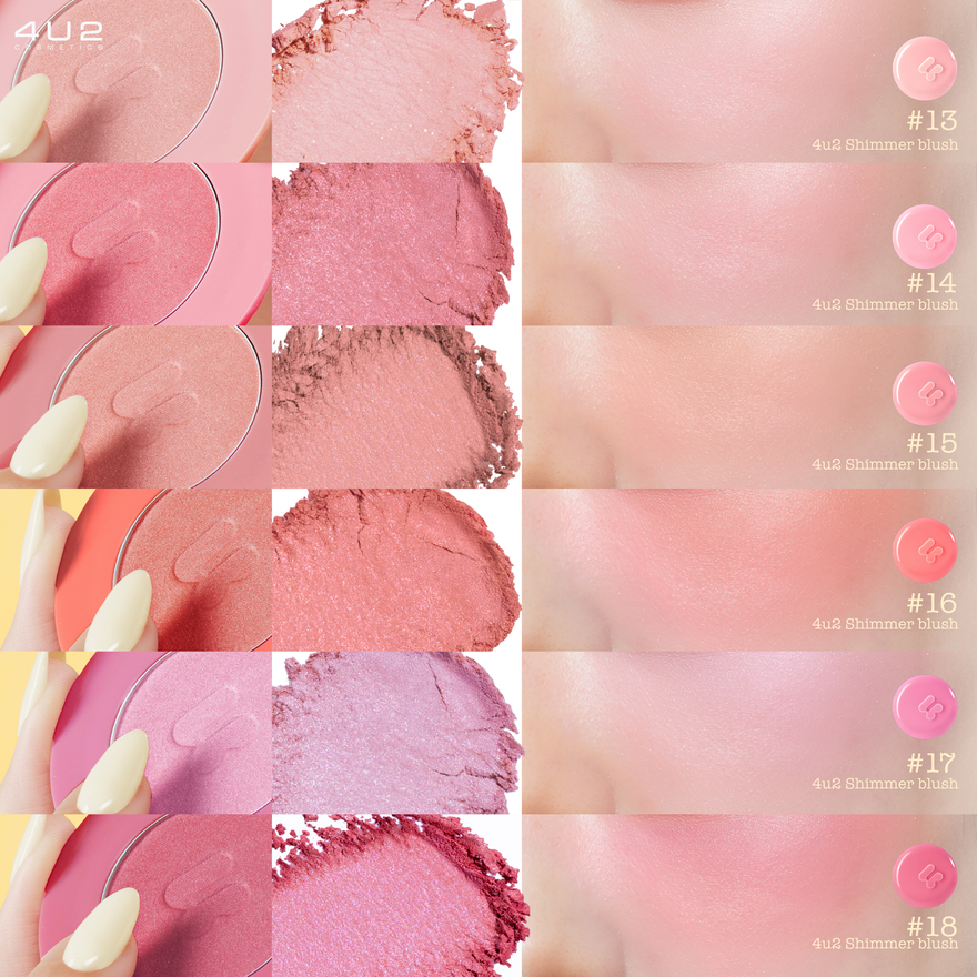 โฟร์ยูทู ชิมเมอร์ บลัช บลัชออนเนื้อชิมเมอร์มอบลุคสดใส เปล่งประกายโกลว์เป็นธรรมชาติ ด้วยเทคโนโลยี Silky Velvet Powder ที่ให้เนื้อสัมผัสนุ่มลื่น เกลี่ยง่าย ไม่เป็นคราบ ผสานกับมุกเนื้อ ละเอียดประกาย เล่นแสง Pearlescent Glow ช่วยเพิ่มมิติให้พวงแก้มดูสุขภาพดีและมีชีวิตชีวาอย่างเป็นธรรมชาติ บลัชออนนี้เหมาะกับทุกโทนผิว ไม่ว่าจะสวยลุคใสๆ สบายๆ หรือลุคจัดเต็ม บลัชออนนี้ยังเหมาะกับทุกโทนผิวไม่ดรอประหว่างวัน เติมระหว่างวันได้โดยไม่ทำให้ผิวดูมัน หรือหนาเกินไปให้คุณมั่นใจ ในลุคแก้มโกลว์ฉ่ำที่ ดูสดชื่นตลอดวัน