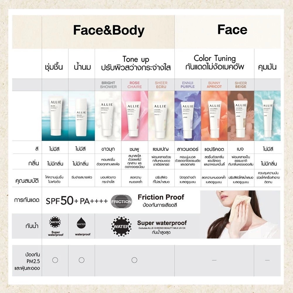 อัลลี่ โครโน บิวตี้ ยูวี เอสพีเอฟ50+ พีเอ++++ เคอร์บี้ เจลกันแดดเมคอัพเบส SPF50+ PA++++ ปรับสีผิว ดูเรียบเนียน รูขุมขนดูเบลอ กันแดดสำหรับผิวหน้า เบสสีเนื้อ จากญี่ปุ่น ช่วยปรับสีผิวให้ผิวเนียนสม่ำเสมอ เบลอรูขุมขน ให้ผิวดูสวย ไม่มัน ในขั้นตอนเดียว ช่วยให้เมคอัพติดทนนานขึ้น มีแคปซูลอนุภาคขนาดเล็ก ที่ช่วยป้องกันรังสียูวีและเบลอรูขุมขน มากับแพคเก็จจิ้ง featuring ALLIE x PEANUTS ธีมการเดินทางไปยังสถานที่ต่างๆในญี่ปุ่น SPF 50+, PA++++ กันการเสียดสี กันน้ำ เบลอรูขุมขน ปกป้องผิวจากเศษฝุ่น ละอองเกสรดอกไม้ และอนุภาคขนาดเล็ก รวมถึง PM 2.5 ไม่ให้เกาะติดผิว สูตรเป็นมิตรต่อท้องทะเล โดยคำนึงถึงกฏข้อบังคับในการใช้ผลิตภัณฑ์กันแดดจากหลากหลายประเทศทั่วโลก มาร่วมเดินทางไปด้วยกัน กับการเดินทางที่จะทำให้คุณและโลกสวยงาม