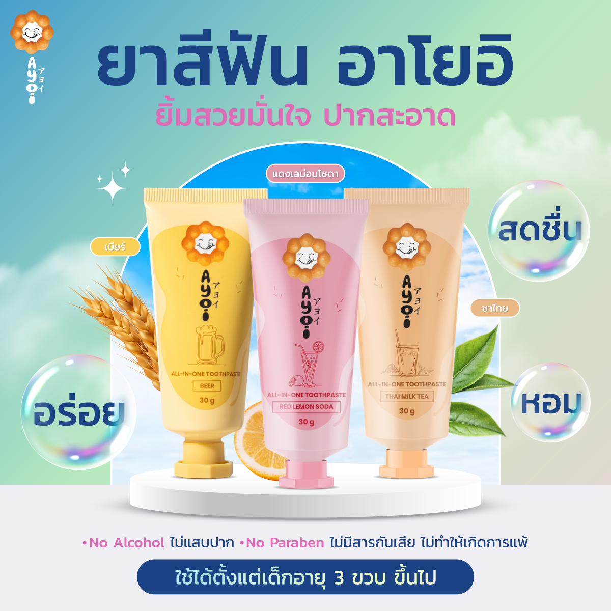 เปลี่ยนการแปรงฟันที่น่าเบื่อ ให้กลายเป็นความสุข ด้วยยาสีฟันอาโยอิ ออล-อิน-วัน รสชาไทย ดูแลสุขภาพฟัน เหงือกและช่องปากด้วยคุณสมบัติ All-in-One ขจัดคราบพลัค ลดการสะสมของแบคทีเรีย ป้องกันฟันผุ ช่วยให้ฟันขาวสะอาด ระงับกลิ่นปากพร้อมลมหายใจหอมสดชื่น - ฟันขาวสะอาด (Dicalcium Phosphate Dihydrate) - ลดแบคทีเรีย (Calcium Carbonate) - ลมหายใจหอมสดชื่น (Cyclodextrin) - ป้องกันฟันผุ ฟันไม่ด่าง (Fluoride 1250 PPM) - ลดการเสียวฟัน (Potassium Citrate) รสชาไทย หวานละมุน หอมชาไทย เข้มข้น นัวนุ่ม เพลิดเพลินเหมือนได้ดื่มชาไทยระหว่างแปรงฟัน Sugar Free - ไม่ทำให้ฟันผุ Paraben Free - ปลอดภัย ไม่ก่อให้เกิดอาการแพ้ No Alcohol - ไม่มีแอลกอฮอล ไม่แสบปาก สารประกอบนำเข้าจากญี่ปุ่น Perfume amp; Flavor จากฝรั่งเศส
