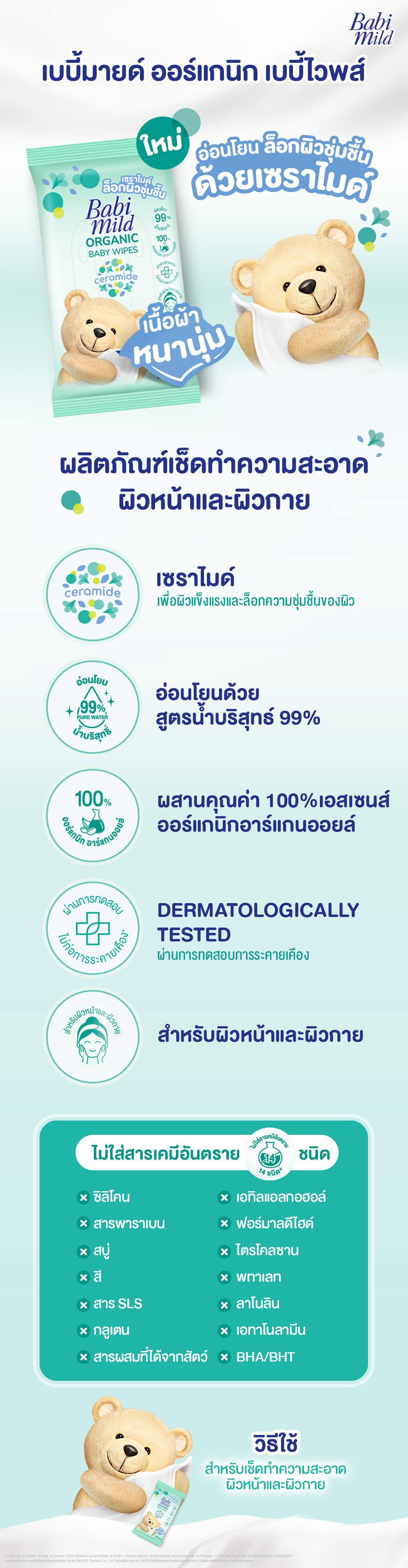 เบบี้มายด์ ออร์แกนิก เบบี้ไวพส์ ผลิตภัณฑ์เช็ดทำความสะอาดผิวหน้าและผิวกาย อ่อนโยน ด้วยสูตรน้ำบริสุทธิ์ 99 มีเซราไมด์ เพื่อผิวแข็งแรง และล็อกความชุ่มชื่นของผิว ผสานคุณค่าจาก 100 เอสเซนส์ออร์แกนิก อาร์แกนออยล์ ไม่ใส่สารเคมีอันตรายชนิด 14 ชนิด ผ่านทดสอบ Dermatologist Tested ว่าไม่ก่อให้เกิดการระคายเคือง ใช้เช็ดทำความสะอาดผิวหน้าและผิวกาย- ควรปิดสติ๊กเกอร์ให้สนิททุกครั้ง เพื่อรักษาความสะอาด คงความชุ่มชื่นในผลิตภัณฑ์ ผลิตภัณฑ์เช็ดทำความสะอาดผิวหน้าและผิวกาย อ่อนโยนด้วยสูตรน้ำบริสุทธิ์ 99 มีเซราไมด์ เพื่อผิวแข็งแรง และล็อกความชุ่มชื่นของผิว