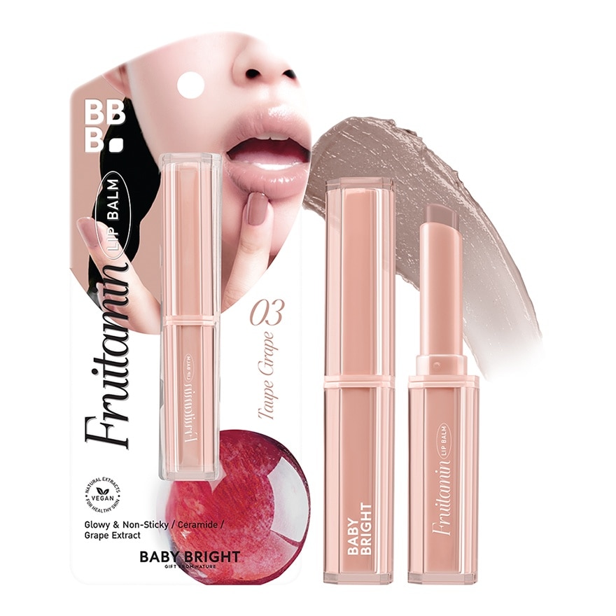 เติมความสดใสและบำรุงริมฝีปากด้วยเบบี้ไบร์ท ฟรุตตามินลิปบาล์ม ลิปบาล์มเนื้อเนียนนุ่ม ช่วยมอบความรู้สึกเบาสบาย ให้ริมฝีปากอวบอิ่ม เรียบเนียน หอมกลิ่นผลไม้นานาชนิด เสริมคุณค่าสารสกัดวีแกน 100 ด้วยคุณประโยชน์จากเชียบัตเตอร์ (Butyrospermum Parkii (Shea) Butter) และน้ำมันโจโจ้บา (Simmondsia Chinensis (Jojoba) Seed Oil) ช่วยเติมความชุ่มชื้น กักเก็บน้ำให้ริมฝีปากเนียนนุ่ม ไม่แห้งตึง ผสานสารสกัดจากวิตามินอี (Tocopheryl Acetate) ที่มีสารแอนตี้ออกซิแดนท์ บำรุงริมฝีปากที่หมองคล้ำให้กลับมาสดใส และเซราไมด์ (Ceramide) ช่วยฟื้นบำรุงริมฝีปากที่แห้งแตก ลอกเป็นขุย ให้กลับมาชุ่มชื้นเรียบเนียน ทั้งยังมีน้ำมันมะกอก (Olea Europaea (Olive) Fruit Oil) ที่ช่วยลดเลือนริ้วรอยร่องปาก และน้ำมันละหุ่ง (Ricinus communis (Castor) Seed Oil) ช่วยบำรุงให้ริมฝีปากชุ่มชื้น เผยสีธรรมชาติของริมฝีปากและเพิ่มความสดใสดูสุขภาพดีอย่างน่าสัมผัส ปราศจากพาราเบนและแอลกอฮอล์