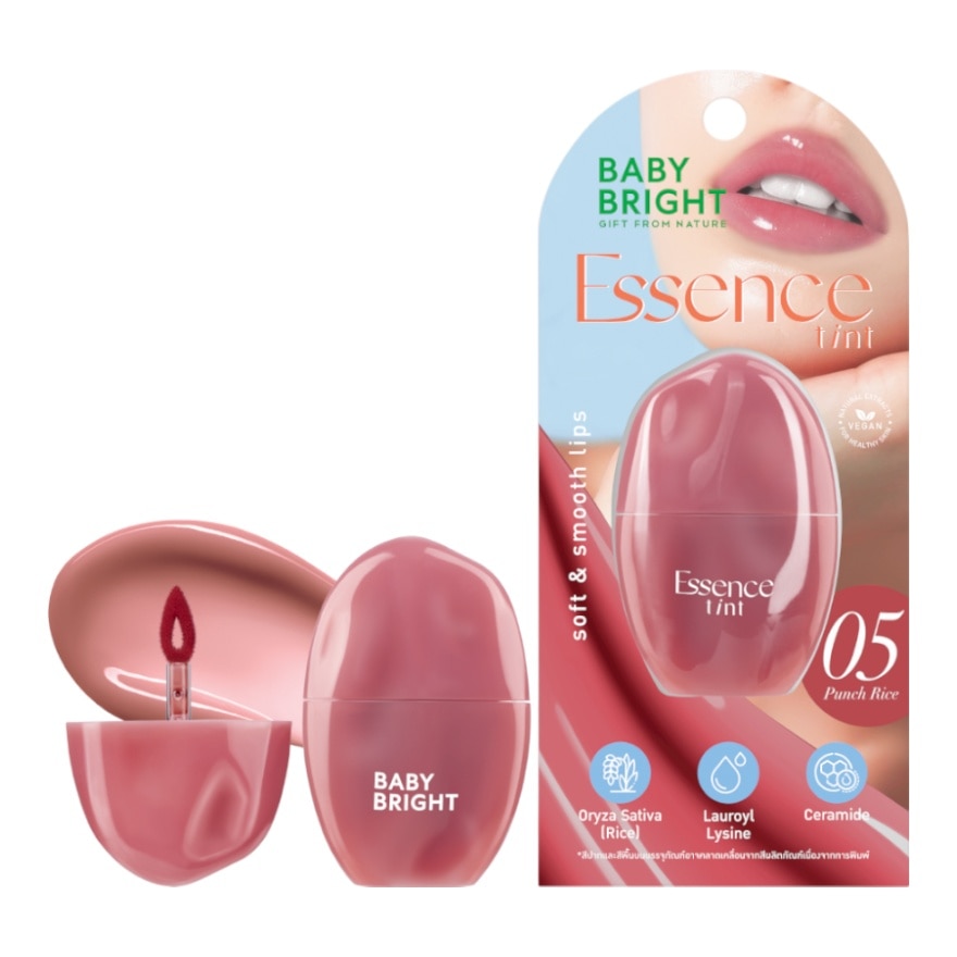 เติมความชุ่มชื้นให้ริมฝีปากอวบอิ่ม วาวสวยดูสุขภาพดีด้วยเบบี้ไบร์ท เอสเซนส์ทินท์ ลิปทินท์เนื้อฉ่ำวาว สัมผัสเนียนนุ่ม บางเบาไม่หนักปาก พร้อมเสริมคุณค่าสูตรวีแกน 100 ด้วยสารสกัดจากน้ำมันรำข้าว (Oryza Sativa (Rice) Bran Oil) และสารสกัดจากกรดมะพร้าวธรรมชาติ CAPRYLIC/CAPRIC TRIGLYCERIDE ผสานเข้ากับสารสกัดจากยีสต์ที่ได้จากการหมัก (Saccharomyces Ferment) รวมถึงอนุพันธ์ของกรดอะมิโน (Lauroyl Lysine) ที่ช่วยเติมความชุ่มชื้นให้ริมฝีปากเนียนนุ่ม ลดเลือนริ้วรอยร่องปากให้ตื้นขึ้น ทั้งยังมีเซราไมด์ (Ceramide) ช่วยคงความชุ่มชื้น ฟื้นบำรุงริมฝีปากที่แห้งแตกให้กลับมาชุ่มชื้นเรียบเนียน เพิ่มการบำรุงด้วยวิตามินอี (Tocopherol) ที่มีสารแอนตี้ออกซิแดนท์ ช่วยบำรุงและเติมความชุ่มชื้น ให้ฟินิชลุคริมฝีปาก พวงแก้ม และเปลือกตาสดใส เปล่งปลั่ง ดูสุขภาพดีอย่างเป็นธรรมชาติ ปราศจากพาราเบน