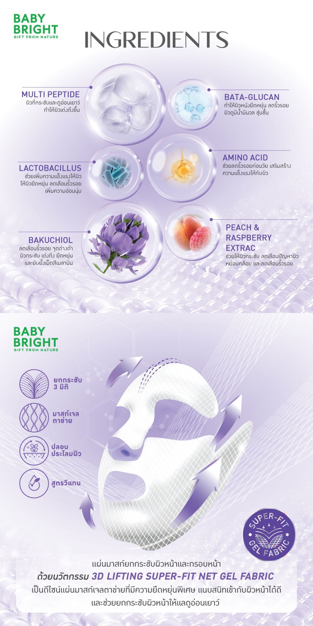 เบบี้ไบร์ท โอลิจิอัพ 3ดีลิฟติ้งฟูลเฟสเน็ตเจลมาสก์ แผ่นมาสก์ยกกระชับผิวหน้าและกรอบหน้า ด้วยนวัตกรรม 3D Lifting Super Fit Net Gel Fabric เป็นดีไซน์แผ่นมาสก์เจลตาข่ายที่มีความยืดหยุ่นพิเศษ แนบสนิทเข้ากับผิวหน้าได้ดี และช่วยยกกระชับผิวหน้าให้แลดูอ่อนเยาว์ อุดมไปด้วยมัลติเปปไทด์ 10 ชนิด และบากูชิล ช่วยส่งเสริมคอลลาเจน ทำให้ผิวกระชับ เต่งตึง ผสานคุณประโยชน์จากแลคโตบาซิลัส 5 ชนิด ที่ได้จากการหมักพืช เช่น ถั่วเหลือง ทับทิม อะเซโรลาเชอร์รี่ กระเจี๊ยบ และวาซาบิ เป็นจุลินทรีย์ที่มีประโยชน์ต่อผิว ช่วยฟื้นบำรุงให้ผิวเรียบเนียน ช่วยดูแลผิว พร้อมช่วยให้ผิวเปล่งปลั่งดูสุขภาพดี ทั้งยังมีกรดอะมิโน และเบตากลูแคน ช่วยฟื้นบำรุงผิวและเสริมสร้างเกราะป้องกันผิว ให้ผิวแข็งแรง มีสารสกัดจากพีช และสารสกัดจากราสป์เบอร์รี่ ช่วยให้ผิวเนียนนุ่มชุ่มชื้น มีความยืดหยุ่น ฟื้นบำรุงผิวให้ดูอ่อนเยาว์ เผยผิวกระชับ เรียบเนียน ดูสุขภาพดีอย่างเป็นธรรมชาติ