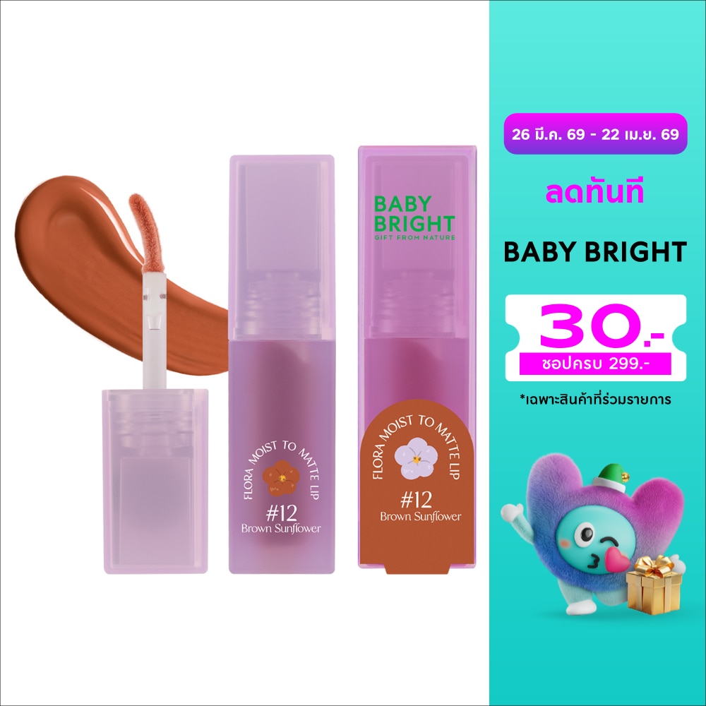 ร่วมสนุกไปกับลิปเนื้อสัมผัสใหม่จาก Baby Bright Flora Moist to Matte Lip ลิปเนื้อมอยส์และแมทท์ในแท่งเดียว ให้สัมผัสแรกฉ่ำวาว เมื่อเบลนด์แล้วจะได้ฟินิชลุคเป็นลิปแมทท์เนื้อกำมะหยี่ เนียนนุ่มดุจใยไหม เกลี่ยง่าย ไม่หนักปาก สีชัด ติดทน เสริมคุณค่าสูตรวีแกน 100เปอร์เซ็นต์ อุดมไปด้วยสารสกัดจากใบไฮเดรนเยีย น้ำมันเมล็ดองุ่นสารสกัดจากดอกคาเมเลียและวิตามินอี มีสารแอนตี้ออกซิแดนท์ ช่วยปกป้องริมฝีปากจากมลภาวะ ลดเลือนริ้วรอยร่องปาก พร้อมกักเก็บความชุ่มชื้นและความยืดหยุ่นให้ริมฝีปากดูเรียบเนียน อ่อนนุ่ม สุขภาพดี มีเสน่ห์อย่างน่าหลงใหล ปราศจากแอลกอฮอล์และพาราเบน