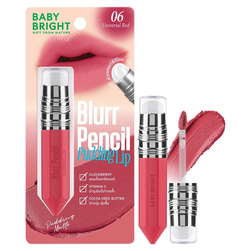 เบบี้ไบร์ท เบลอเพนซิลพุดดิ้งลิป ลิปเนื้อพุดดิ้ง เบลอปากฟุ้งละมุน เกลี่ยง่าย สีชัด ติดทน มาพร้อมแปรงหัวซิลิโคนนุ่ม เด้งดึ๋ง ช่วยเกลี่ยและเบลอริมฝีปากให้เรียบเนียน และช่วยเติมเต็มร่องปากให้แลดูอวบอิ่ม เสริมคุณค่าวีแกน 100 พร้อมสารสกัดจากน้ำมันเมล็ดคลาวด์เบอร์รี่ (Rubus Chamaemorus Seed Extract (Cloudberry)) และโกโก้บัตเตอร์ (Theobroma Cacoa (Cacoa) Seed Butter) ที่มีสารแอนตี้ออกซิแดนท์ ช่วยเพิ่มความชุ่มชื้นแก่ริมฝีปาก และมีวิตามินซี (Vitamin C) ช่วยบำรุงให้ริมฝีปากที่หมองคล้ำแลดูกระจ่างใส พร้อมเติมสีสันให้พวงแก้ม ริมฝีปาก และดวงตาดูสดใส ให้ฟินิชลุคแบบแมทท์กึ่งกำมะหยี่ มอบริมฝีปากสีสวย ดูอิ่มฟู มั่นใจตลอดวัน ปราศจากแอลกอฮอล์และพาราเบน