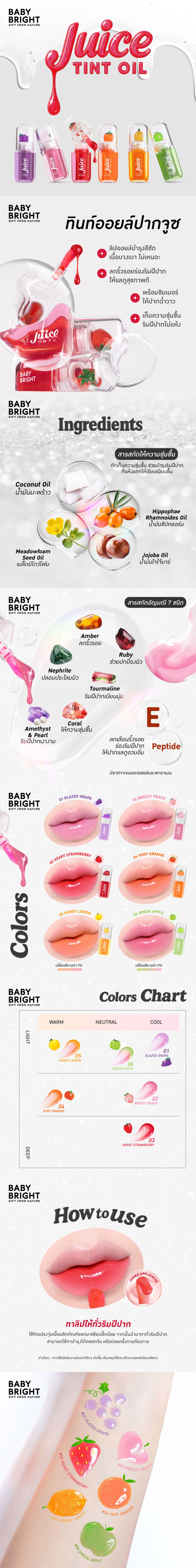 เบบี้ไบร์ท จูซทินท์ออยล์ ลิปออยล์บำรุงริมฝีปาก สีชัด เนื้อบางเบา ไม่เหนียวเหนอะหนะ มาพร้อมชิมเมอร์ให้ริมฝีปากดูฉ่ำวาว อุดมไปด้วยสารสกัดจากน้ำมันซีบัคธอร์น (Hippophae Rhamnoides Fruit Oil) ช่วยเพิ่มและคงความชุ่มชื้นให้ริมฝีปาก สารสกัดจากน้ำมันมะพร้าว (Coconut Oil) ที่ช่วยบำรุงริมฝีปากที่แห้งแตกให้เรียบเนียนขึ้น น้ำมันโจโจ้บา (Simmondsia Chinensis (Jojoba) Seed Oil) ช่วยลดการสูญเสียน้ำ ช่วยให้ริมฝีปากแลดูอ่อนเยาว์ น้ำมันเมล็ดมีโดว์โฟม (Limnanthes Alba Seed Oil) และวิตามินอี (Tocopheryl Acetate) ที่มีสารแอนตี้ออกซิแดนท์ ช่วยบำรุงริมฝีปาก พร้อมเติมเต็มความชุ่มชื้น ดูเรียบเนียน และช่วยลดเลือนริ้วรอยร่องปาก ผสานเข้ากับอัญมณีจากธรรมชาติ 7 ชนิด ได้แก่ Amber Powder, Amethyst Powder, Pearl Powder, Coral Powder, Nephrite Powder, Ruby Powder, Tourmaline ที่ช่วยบำรุงและลดเลือนริ้วรอยร่องปาก ให้ความชุ่มชื้นแก่ริมฝีปาก และเปปไทด์ (Palmitoyl Tripeptide-38) ช่วยลดริ้วรอยร่องปาก ให้ริมฝีปากแลดูสุขภาพดี ปราศจากแอลกอฮอล์และพาราเบน