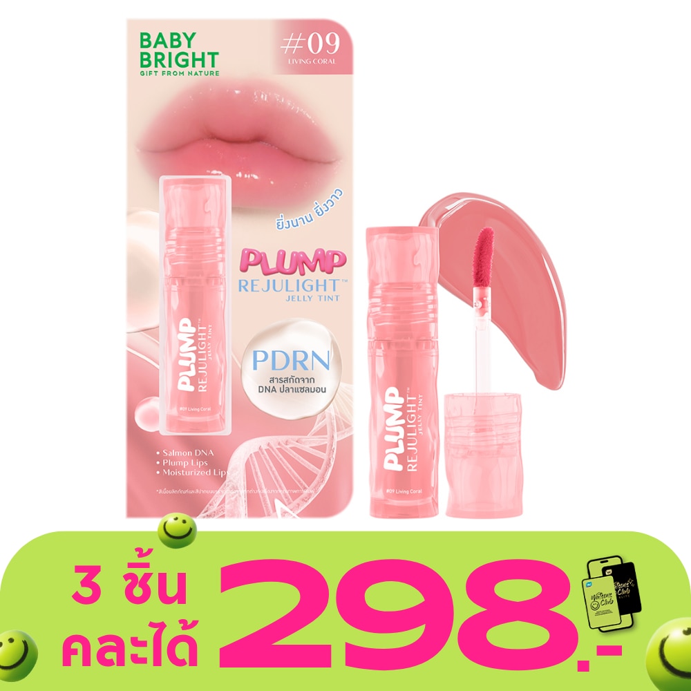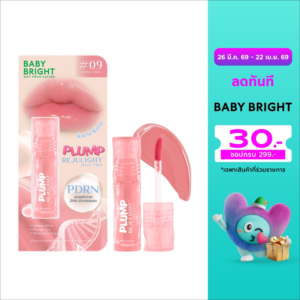 เติมความอิ่มฟูให้ริมฝีปากดูแวววาวราวกระจกด้วย เบบี้ไบร์ท พลัมพ์รีจูไลท์เจลลี่ทินท์ ลิปกระจกเนื้อเจล สัมผัสนุ่มชุ่มชื้น บางเบาไม่หนักปาก สีสวยชัด ยิ่งทาไว้นาน ยิ่งฉ่ำวาว พร้อมช่วยฟื้นบำรุงริมฝีปากให้ดูอวบอิ่ม เด้งฟูดุจไร้ร่องปาก ด้วยนวัตกรรมการฉีดผิวหน้าวาวใสจากประเทศเกาหลีที่มีสารสกัด SODIUM DNA จากปลาแซลมอน สู่ผลิตภัณฑ์ลิปทินท์พลัมพ์รีจูไลท์เนื้อฉ่ำวาว ช่วยเสริมสร้างคอลลาเจน พร้อมเติมความชุ่มชื้นและความยืดหยุ่นให้แก่ริมฝีปาก ลดเลือนริ้วรอยร่องปากให้ดูตื้นขึ้น ทั้งยังมีสารสกัดจากเห็ดหลินจือ ช่วยปลอบประโลมริมฝีปาก ผสานสารสกัดจากบัวหิมะ ช่วยลดเลือนริ้วรอยร่องปาก ช่วยให้ริมฝีปากแลดูอ่อนเยาว์ สารสกัดจากโสม ช่วยลดเลือนริ้วรอยร่องปาก และช่วยเสริมสร้างคอลลาเจน ช่วยให้ริมฝีปากอวบอิ่ม ทั้งสารสกัดจากน้ำมันเมล็ดโบตั๋น ช่วยลดเลือนริ้วรอยร่องปาก และช่วยเพิ่มความชุ่มชื้นให้ริมฝีปาก เติมสีสันให้ริมฝีปากดูสวย อิ่มฟู ฉ่ำวาว แลดูสุขภาพดีอย่างเป็นธรรมชาติ ปราศจากพาราเบน