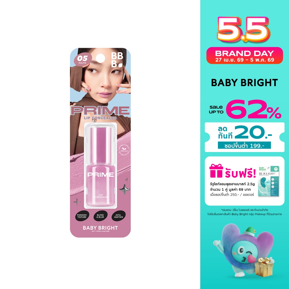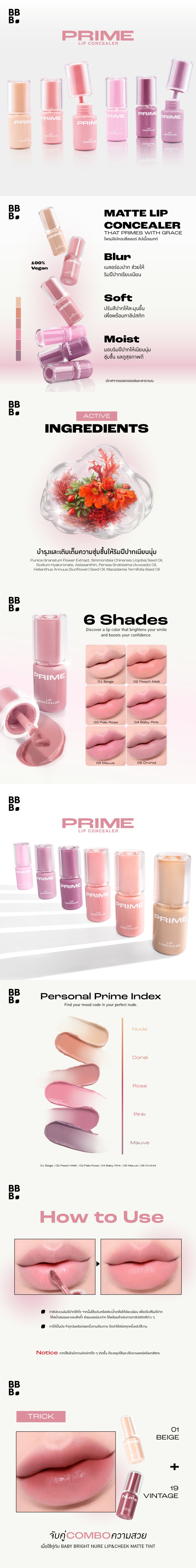 เบบี้ไบร์ท ไพรม์ลิปคอนซีลเลอร์ ลิปเนื้อแมทท์ สัมผัสนุ่มลื่น เกลี่ยง่าย ไม่ทำให้ริมฝีปากแห้งตึง เสริมคุณค่าวีแกน 100 อุดมไปด้วยสารสกัดจาก ดอกทับทิม (Punica Granatum Flower Extract) และสาหร่ายสีแดง (Astaxanthin) ที่อุดมด้วยสารแอนตี้ออกซิแดนท์ ช่วยปกป้องและลดเลือนริ้วรอยบริเวณริมฝีปาก ช่วยป้องกันริมฝีปากไม่ให้แห้งและลอก มอบผลลัพธ์ให้ริมฝีปากสวยตลอดทั้งวัน ผสานกับโซเดียมไฮยาลูรอเนต (SODIUM HYALURONATE) มีคุณสมบัติในการกักเก็บความชุ่มชื้น ป้องกันการสูญเสียน้ำ ทั้งยังมีน้ำมันโจโจ้บา (SIMMONDSIA CHINENSIS (JOJOBA) SEED OIL) ช่วยบำรุงและเติมเต็มความชุ่มชื้นให้ริมฝีปากเนียนนุ่ม แลดูสุขภาพดีอย่างเป็นธรรมชาติ ปราศจากแอลกอฮอล์และพาราเบน