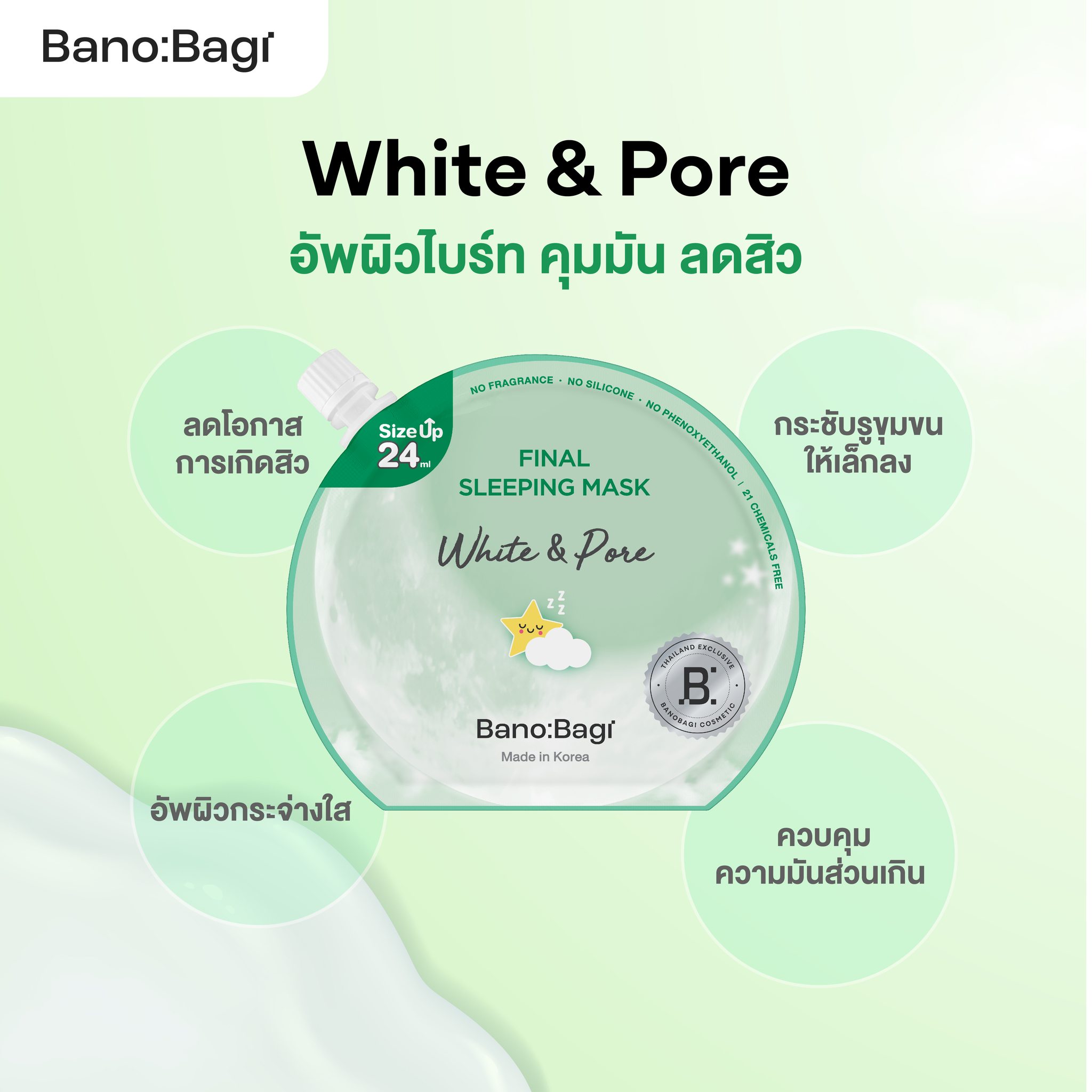 อัพผิวกระจ่างใส คุมมัน ลดสิว กระชับรูขุมขน สลีปปิ้งมาสก์แบบไม่ต้องล้างออกเพื่อ 2 ผลลัพธ์ผิว White Pore ด้วย 4 พลังสารสกัด จากธรรมชาติ (Dragon Blood, Tea Tree, Salicylic, Witch Hazel) อัพผิว กระจ่างใส คุมมัน กระชับรูขุมขนให้ดูเล็กลง ช่วยลดสาเหตุการเกิดสิว เพิ่มสมดุลผิวให้แข็งแรง เผยผิวใหม่เรียบเนียนขึ้น สูตรเฉพาะเพื่อผิวคนไทย ที่คิดค้นและพัฒนาโดยทีมแพทย์จาก รพ.บาโนบากิ ประเทศเกาหลี (อ่อนโยนต่อผิวแพ้ง่าย ไม่มีน้ำหอม ไม่มีซิลิโคนและปราศจากสารระคายเคืองผิวทั้ง 20 ชนิด) ทาสลีปปิ้งมาส์กบริเวณใบหน้าและลำคอในปริมาณที่มากกว่าการทาครีมปกติ เป็นขั้นตอนสุดท้ายของการบำรุงผิวก่อนนอนโดยไม่ต้องล้างออก (ใช้ได้เป็นประจำทุกคืน) สลีปปิ้งมาสก์แบบไม่ต้องล้างออกเพื่อ 2 ผลลัพธ์ผิว White Pore ด้วย 4 พลังสารสกัด จากธรรมชาติ (Dragons Blood, Tea Tree, Salicylic, Witch Hazel) อัพผิวขาวกระจ่างใส คุมมัน กระชับรูขุมขนให้ดูเล็กลง ช่วยลดสาเหตุการเกิดสิว เพิ่มสมดุลผิวให้แข็งแรง เผยผิวใหม่เรียบเนียนขึ้น