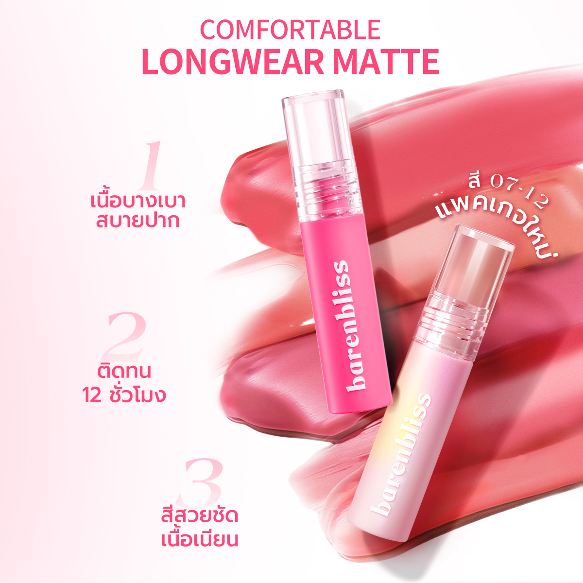 - ติดทนนาน 12 ชั่วโมง ด้วยเทคโนโลยีคัลเลอร์บูสติ้ง ช่วยล็อกสีและกันน้ำได้นาน 12 ชั่วโมง