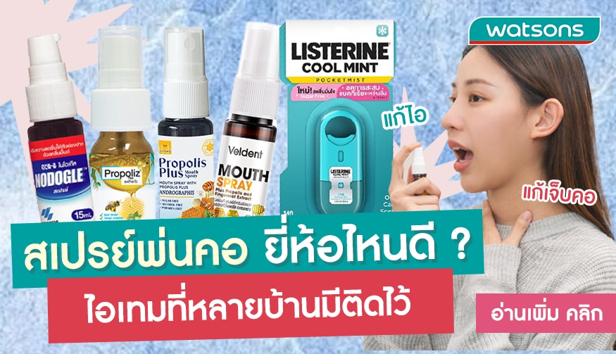 ถ้าพูดถึงไอเทมหรือยาสามัญที่ควรมีติดบ้าน สิ่งหนึ่งเลยที่อยากจะแนะนำก็คือ “สเปรย์พ่นคอ” ตัวช่วยบรรเทาอาการเจ็บคอ ระคายคอ คอแห้ง และเสียงแหบได้อย่างรวดเร็ว มาในรูปแบบสเปรย์ใช้ฉีดพ่น ใช้งานง่าย พกพาสะดวก เป็นตัวช่วยที่ดีมาก เมื่อมีอาการไข้ หรือเจ็บป่วยเล็กๆ น้อยๆ วัตสันเลยอยากชวนทุกคนมาทำความรู้จักกับสเปรย์พ่นคอยี่ห้อไหนดี รวมถึงยาพ่นแก้เจ็บคอ และสเปรย์พ่นคอแก้ไอ ให้มากขึ้นในบทความนี้