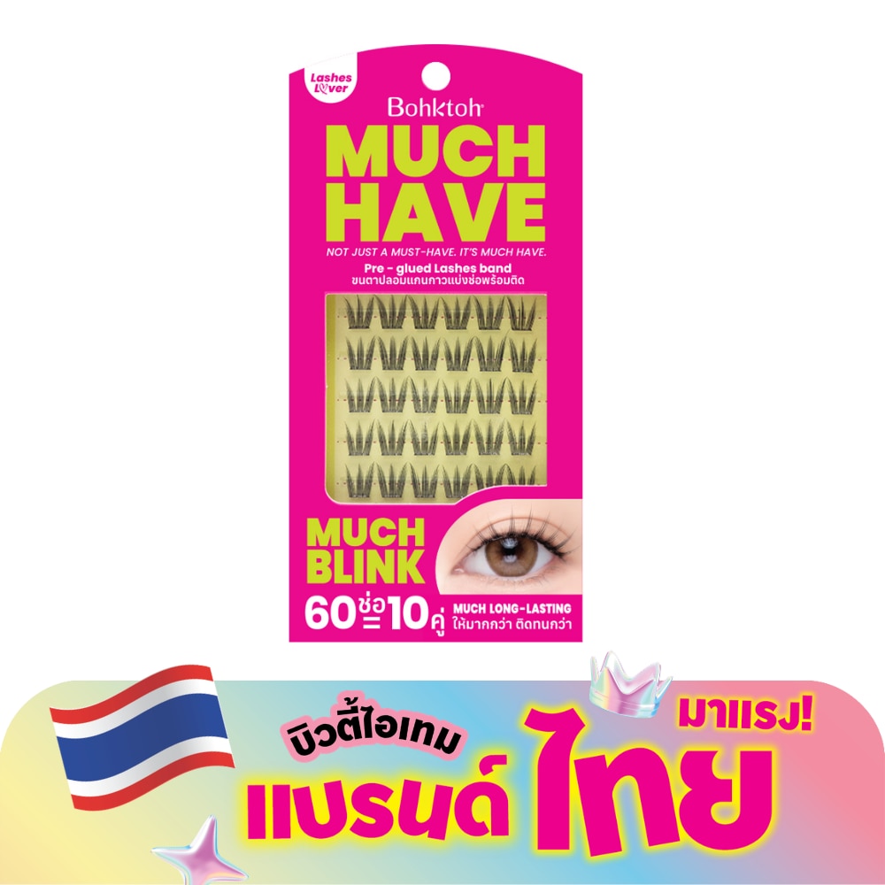 บอกต่อ มัช แฮฟ พรี กลู แลชเชส ขนตาปลอมแกนกาวแบ่งช่อพร้อมติดเรียงตัวสวยมีเลเซอร์ เสริมลุคให้ดูเฉี่ยว ติดแล้วลุคดูเป๊ะขึ้นแบบไม่ต้องพูด เพราะความสวย มักพูดแทนเราเสมอขนตาปลอมแกนกาวพร้อมติด สวยไว ไม่ง้อกาว! เปลี่ยนลุคธรรมดาให้ปังได้ในพริบตา ด้วยขนตาปลอบแกนกาวพร้อมติด ที่ตอบโจทย์ผู้หญิงยุคใหม่ ให้ติดง่าย สวยไวและสะดวกสบายในขั้นตอนเดียว ไม่ต้องใช้กาวติดขนตาปลอม ไม่ต้องรอกาวแห้ง ไม่ต้องกลัวเลอะ! ด้วยแกนกาวเนียนกลืนไปกับขบขนตาจริง มีให้เลือกหลากหลายสไตล์มาพร้อมกับความคุ้มค่าจำนวน 60 ช่อ หรือเท่ากับใช้งานได้มากถึง 5 คู่เลยให้สาว ๆ สวยคุ้มได้ในทุกวัน แม้สาวมือใหม่ก็ติดเองได้ภายในไม่กี่วินาที
