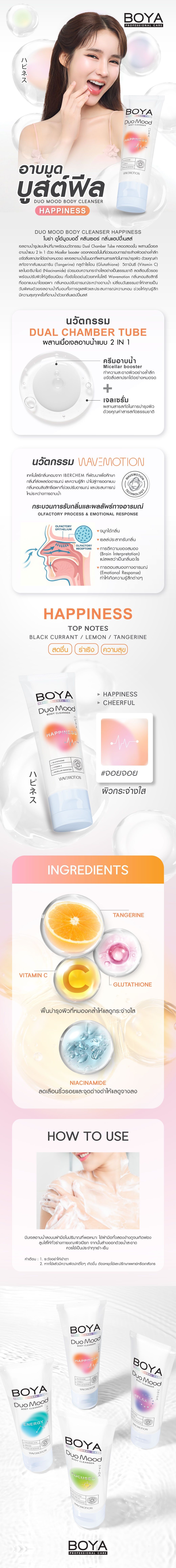 เปิดรับวันใหม่ได้อย่างมีความสุขด้วย โบย่า ดูโอ้มูดบอดี้คลีนเซอร์ กลิ่นแฮปปี้เนสส์ เจลอาบน้ำรูปแบบใหม่ที่มาพร้อมนวัตกรรม Dual Chamber Tube หลอดสองชั้น ผสานเนื้อเจลอาบน้ำแบบ 2 In 1 ด้วย Micellar booster ของหลอดชั้นในที่ช่วยมอบการชำระล้างผิวอย่างล้ำลึก ขจัดสิ่งสกปรกได้อย่างหมดจด และเจลอาบน้ำชั้นนอกที่ผสานสารสกัดในการบำรุงผิว ด้วยคุณค่าสกัดจากส้มแมนดาริน (Tangerine) กลูต้าไธโอน (Glutathione) วิตามินซี (Vitamin C) และไนอะซินาไมด์ (Niacinamide) ช่วยมอบความกระจ่างใสอย่างเป็นธรรมชาติ ลดเลือนริ้วรอย พร้อมปรับผิวให้ดูเรียบเนียน ทั้งยังโดดเด่นด้วยเทคโนโลยี Wavemotion กลิ่นหอมลิขสิทธิ์ที่ออกแบบมาโดยเฉพาะ กลิ่นหอมปรับอารมณ์ระหว่างอาบน้ำ เปลี่ยนวันธรรมดาให้กลายเป็นวันพิเศษด้วยเจลอาบน้ำที่มอบทั้งการดูแลผิวและประสบการณ์ความหอม ช่วยให้คุณรู้สึกมีความสุขทุกครั้งที่อาบน้ำด้วยกลิ่นแฮปปี้เนสส์