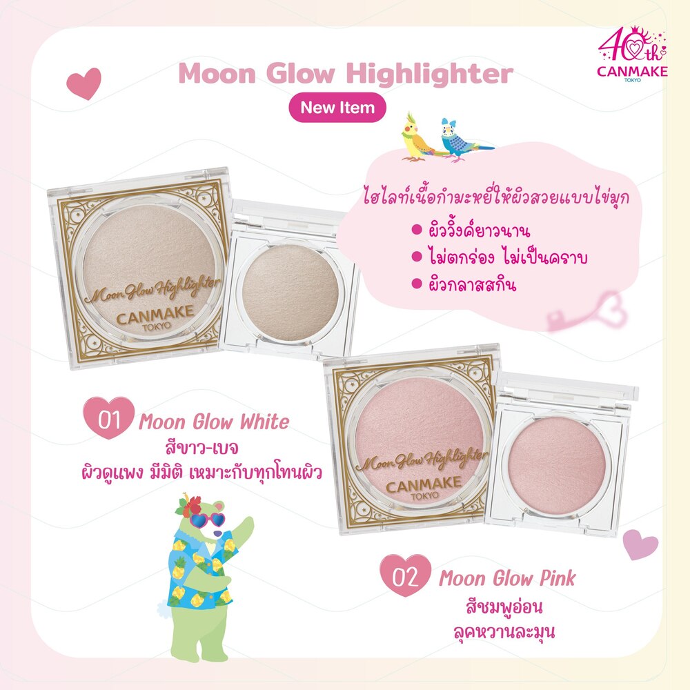 Canmake Moon Glow Highlighter 3.7g. ไฮไลท์เตอร์เนื้อมูนได้รับการรังสรรค์อย่างพิถีพิถันผ่านกระบวนการพิเศษในการอบและบดอนุภาคไข่มุกละเอียด ทำให้เกิดสูตรอันน่าทึ่งที่ช่วยเสริมความเปล่งประกายเป็นธรรมชาติให้กับผิว ไฮไลท์เตอร์สร้างประกายแวววาวสวยงามที่สามารถรับแสงได้จากทุกมุม เพิ่มมิติและความลึกให้กับใบหน้า ไม่ว่าจะใช้แบบบางเบาหรือทาหลายชั้นเพื่อให้ได้เอฟเฟกต์ที่ดราม่ามากขึ้น ไฮไลท์เตอร์ก็สามารถเล่นกับแสงได้ตลอดทั้งวัน ช่วยให้ผิวของคุณดูสดชื่น เปล่งปลั่ง และเป็นธรรมชาติ และด้วยวิธีการผลิตในรูปแบบนี้ยังทำให้เนื้อไฮไลท์ที่ทำจากแป้งนั้นแข็งตัวเป็นรูปทรงวงกลมคล้ายพระจันทร์สวยงาม และยังคงประสิทธิภาพและคุณภาพของไข่มุกไม่ให้แตกหรือเสียหาย