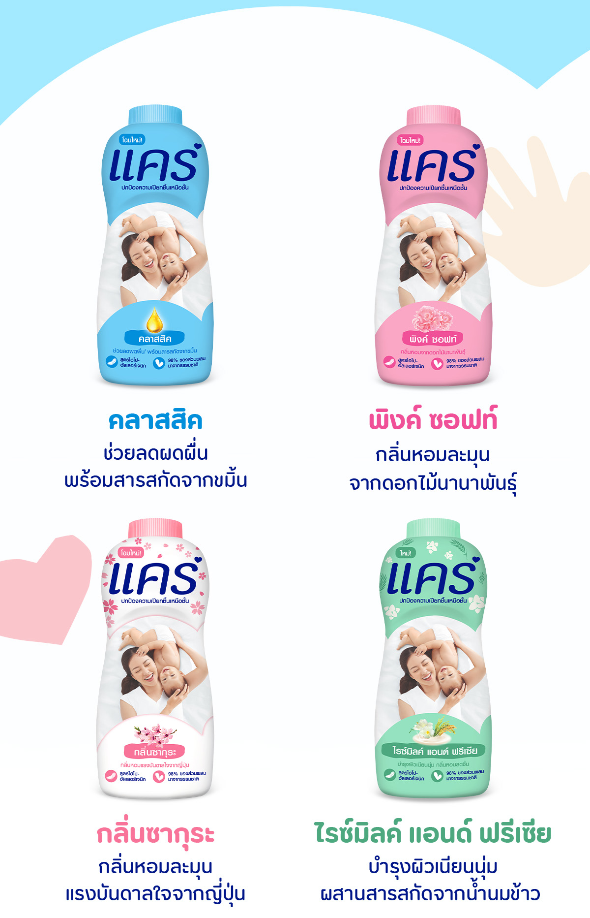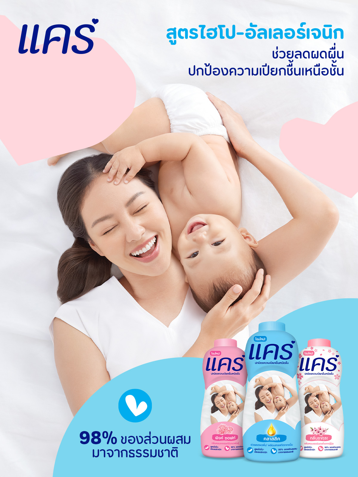 แป้งเด็กแคร์ พิงค์ ซอฟท์ -กลิ่นพิงค์ ซอฟท์ หอมดอกไม้นานาพันธุ์ -แคร์ สูตร ไฮโป-อัลเลอร์เจนิก ผ่านการทดสอบไฮโป อัลเลอร์เจนิกและทางการแพทย์ผิวหนังสหรัฐอเมริกา แล้วว่าเป็นสูตรที่อ่อนโยน ไม่ระคายเคือง ไม่ก่อให้เกิดการแพ้ จึงปลอดภัยต่อผิวบอบบางเสมือนผิวลูกน้อย หมายเหตุ: ไม่ก่อให้เกิดการแพ้ในกลุ่มทดลองเว้นแต่การแพ้ส่วนบุคคลหรือการระคายเคือง -แคร์ ฮายขมิ้น ช่วยลดผดผื่นที่เกิดจากความเปียกชื้นให้ลูกน้อยแห้งสบายตัว -กลิ่นหอมติดทนนาน จากดอกไม้นานาพันธุ์ - (แป้งเด็ก , แป้งแคร์ , Care ) ไม่ก่อให้เกิดการแพ้ในกลุ่มทดลองเว้นแต่การแพ้ส่วนบุคคลหรือการระคายเคือง จากการทดสอบในอาสาสมัครจำนวน 205 คน โดยบริษัท TKL Research Inc. ประเทศสหรัฐอเมริกา ปี 2551