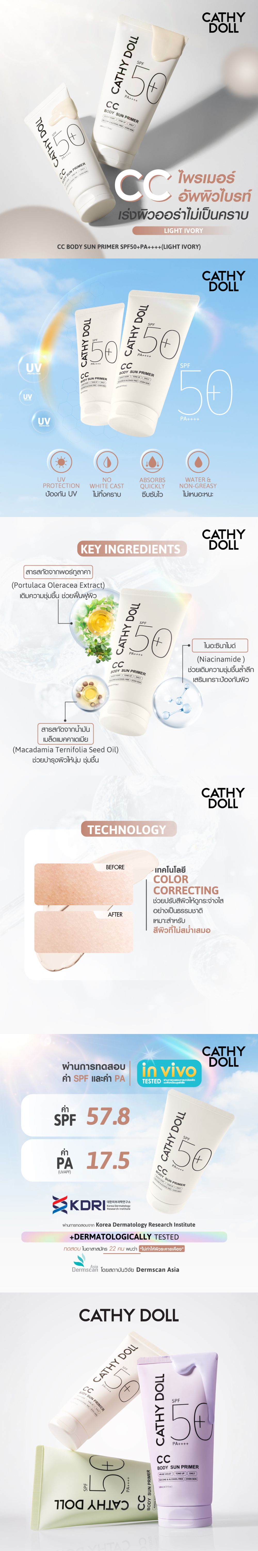 ซีซี บอดี้ ซัน ไพรเมอร์ ใหม่จาก เคที่ดอลล์ เฉดสี Light Ivory ไลท์ไอวอรี่ เหมาะสำหรับสีผิวไม่สม่ำเสมอ ด้วยไพรเมอร์แตกตัวเป็นน้ำ มีเนื้อบางเบาซึมซาบเร็ว ไม่ทิ้งคราบ ที่มาพร้อมเทคโนโลยี Color Correcting ช่วยปรับสีผิวให้ดูกระจ่างใสอย่างเป็นธรรมชาติ พร้อมปกป้องผิวจากแสงแดดด้วย เอสพีเอฟ50+ พีเอ++++ ปกป้องผิวจากรังสี UVA และ UVB ผสานสารสกัดจากน้ำมันเมล็ดแมคคาเดเมีย (Macadamia Ternifolia Seed Oil) ไนอะซินาไมด์ (Niacinamide) และสารสกัดจากพอร์ทูลาคา (Portulaca Oleracea Extract) ช่วยผลัดเซลล์ผิวอย่างอ่อนโยน บำรุงผิวให้ผิวชุ่มชื้นและกระจ่างใส ปกป้องผิวจากแสงแดดที่เกิดขึ้นในระหว่างวัน