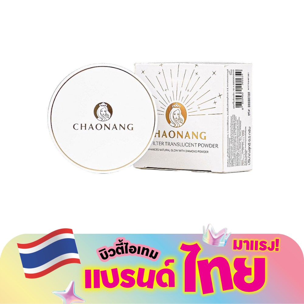แป้งฝุ่นโปร่งแสงสูตรพิเศษ Talc Free มอบงานผิวออกมาดูธรรมชาติและแมท เนื้อแป้งละเอียดเนียนนุ่ม ดุจใยไหม มีส่วนผสมของ Diamond Powder ช่วยเบลอและปรับสภาพผิวให้เนียนเรียบ แลดูกระจ่างใสขึ้น ช่วยดูดซับความมันส่วนเกินบนใบหน้าได้อย่างดี มีส่วนผสมของ Tea Tree Oil และสารที่มีคุณสมบัติช่วยบำรุงผิว (Vitamin E, สารสกัดจากสาหร่ายสีทอง, Ceramides, Coenzyme Q10 และ Sodium Hyaluronate) แป้งฝุ่นโปร่งแสง Chaonang Glow Filter Translucent Powder 6.5 กรัม สูตรพิเศษ ปราศจากทัลค์ มอบผิวดูเป็นธรรมชาติ แมตต์ดุจแพรไหม เนื้อแป้งละเอียด นุ่มดุจแพรไหม ผสาน Diamond Powder ช่วยเบลอและปรับผิวให้เรียบเนียน กระจ่างใส ช่วยดูดซับความมันส่วนเกินบนใบหน้าได้อย่างมีประสิทธิภาพ อุดมด้วยทีทรีออยล์และส่วนผสมบำรุงผิว (วิตามินอี สารสกัดจากสาหร่ายสีทอง เซราไมด์ โคเอนไซม์ Q10 และโซเดียมไฮยาลูโรเนต)