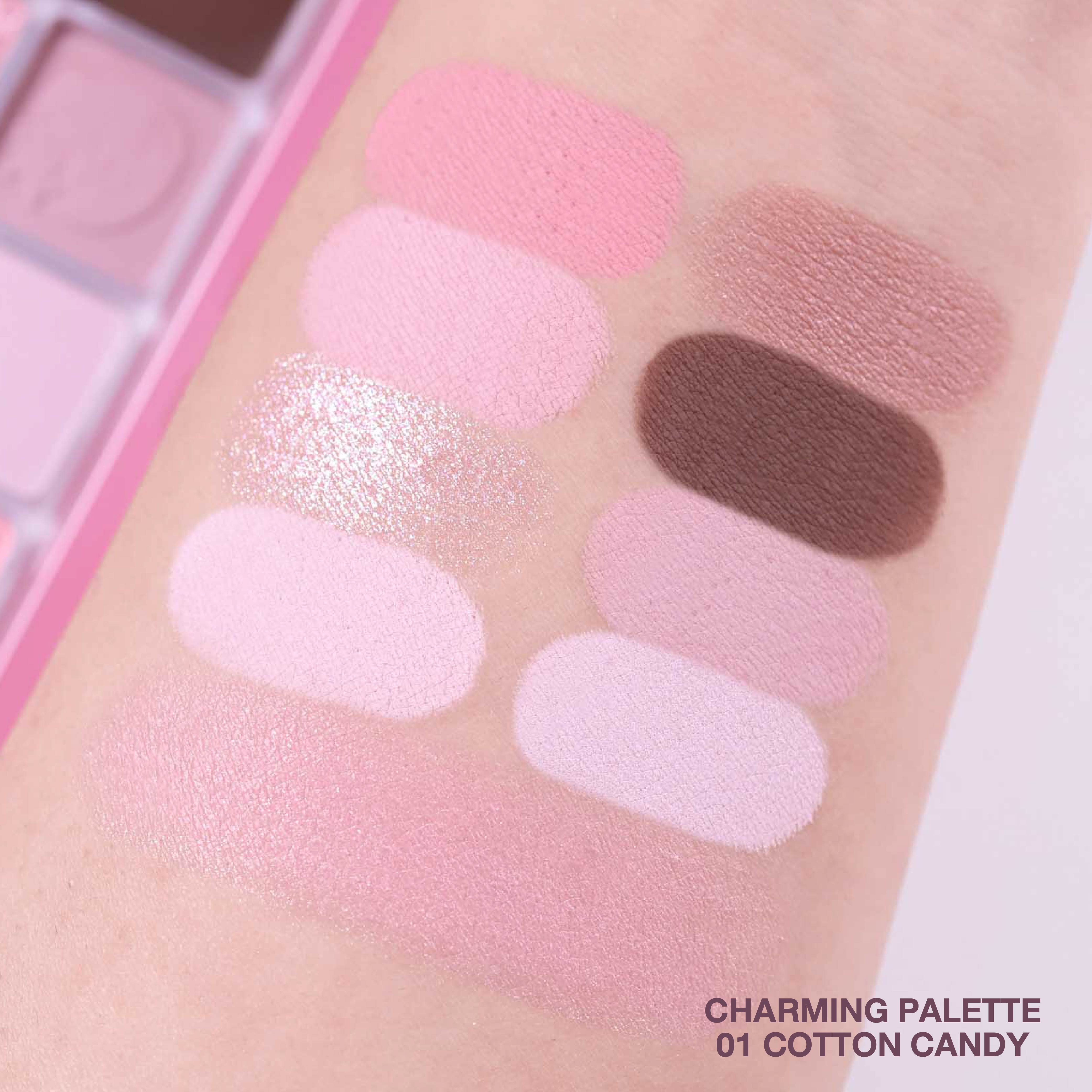 ชาร์มิส บลูมมิ่ง ฮาร์ท ชาร์มมิ่ง พาเลทท์ 01 คอตตอน แคนดี้ เติมเต็มลุคหวานใสด้วยอายแชโดว์ 8 เฉดสีพร้อมบลัชออนและไฮไลท์เตอร์ในตัว โทนชมพูและนู้ดพาสเทลมีทั้งเนื้อแมตต์ ชิมเมอร์ และกลิตเตอร์ให้เลือกครีเอตได้ทั้งลุคธรรมชาติใสๆ จนถึงลุคหวานระยิบระยับสำหรับโอกาสพิเศษ เฉดชมพูพาสเทล หวานละมุน พร้อมลายสตรอว์เบอร์รี่ เหมาะกับสาวที่ชอบลุคโรแมนติก สดใส ดูมีชีวิตชีวา ตลับกะทัดรัด พกง่าย พร้อมลาย My Melody สุดคิ้วท์ที่ทำให้ยิ้มทุกครั้งที่หยิบมาใช้ เนรมิตลุคหวานฉ่ำเปล่งประกายด้วยอายแชโดว์ 8 เฉดสี บลัชออน และไฮไลท์เตอร์ โทนสีพาสเทลสีชมพูอ่อนและสีนู้ด มีทั้งแบบแมตต์ ชิมเมอร์ และกลิตเตอร์ เหมาะสำหรับทุกวันจนถึงโอกาสพิเศษ พาเลตต์ขนาดกะทัดรัด พกพาสะดวก พร้อมดีไซน์ My Melody สุดน่ารัก